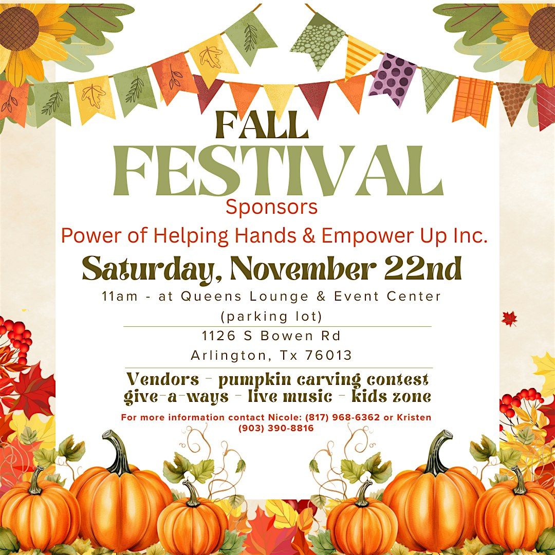 Come join us for a fun-filled Fall Festival at 1126 S Bowen Rd., Arlington, TX 76013 (parking lot)! "Get ready for some autumn adventures! You're invited to the Power of Helping Hands & Empower Up Inc. Fall Festival on Saturday, November 22nd, from 11 AM to 3 PM . Enjoy live music, delicious food from local vendors, face painting for kids, pumpkin carving, dancing, helpful resources, and so much more! Bring your friends and family for a day of fun. Bring your family and friends for a memorable autumn experience. Don't miss out on this fantastic event!