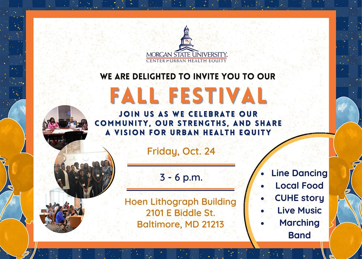 You're invited! The Center for Urban Health Equity (CUHE) at Morgan State University is delighted to host the Fall Festival, and we want you to be a part of it.