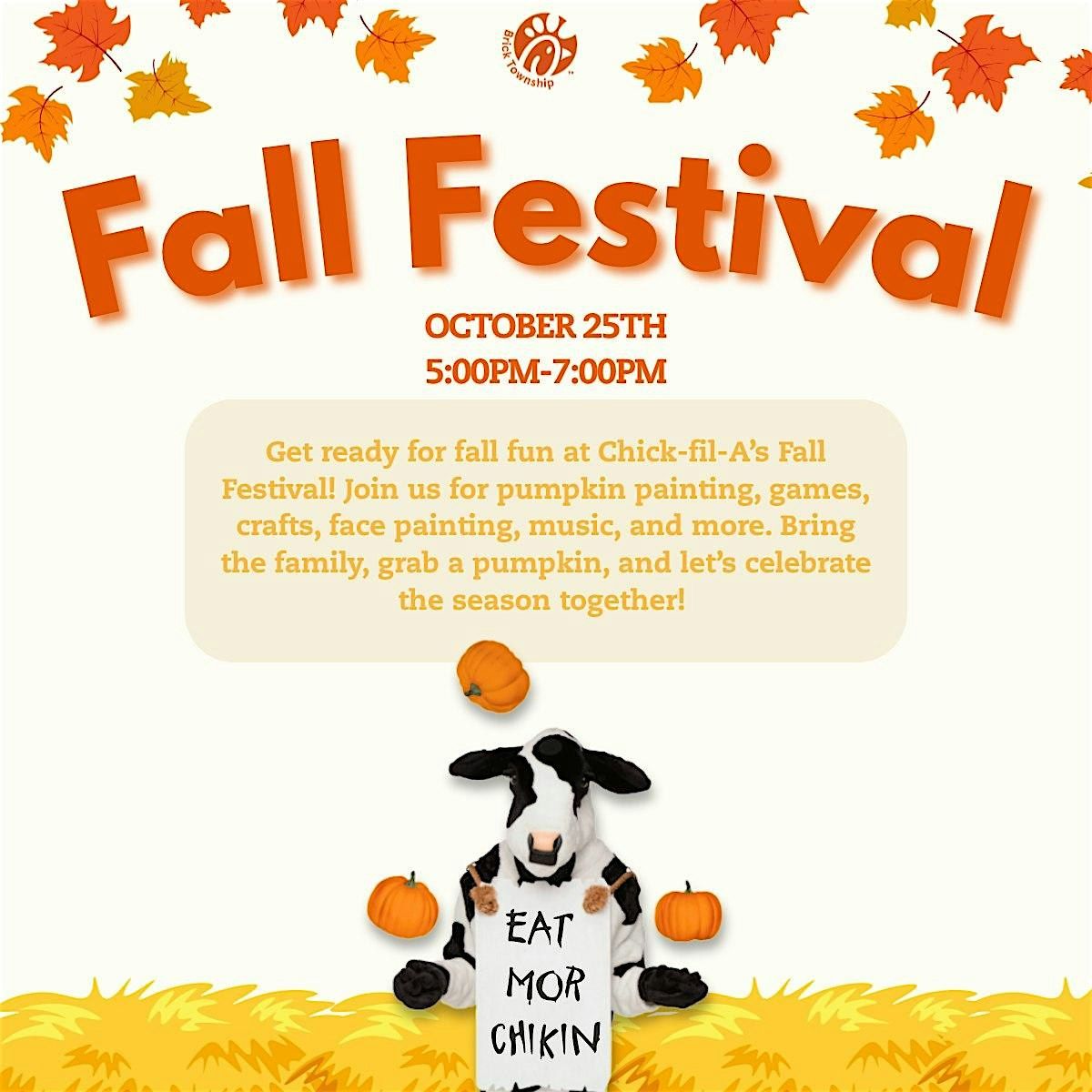 Join us for a day full of fall fun at Chick-fil-A Brick Township's Fall Festival on October 25th from 11:00 AM to 4:00 PM! The event will be held outside and packed with festive activities for the whole family.
