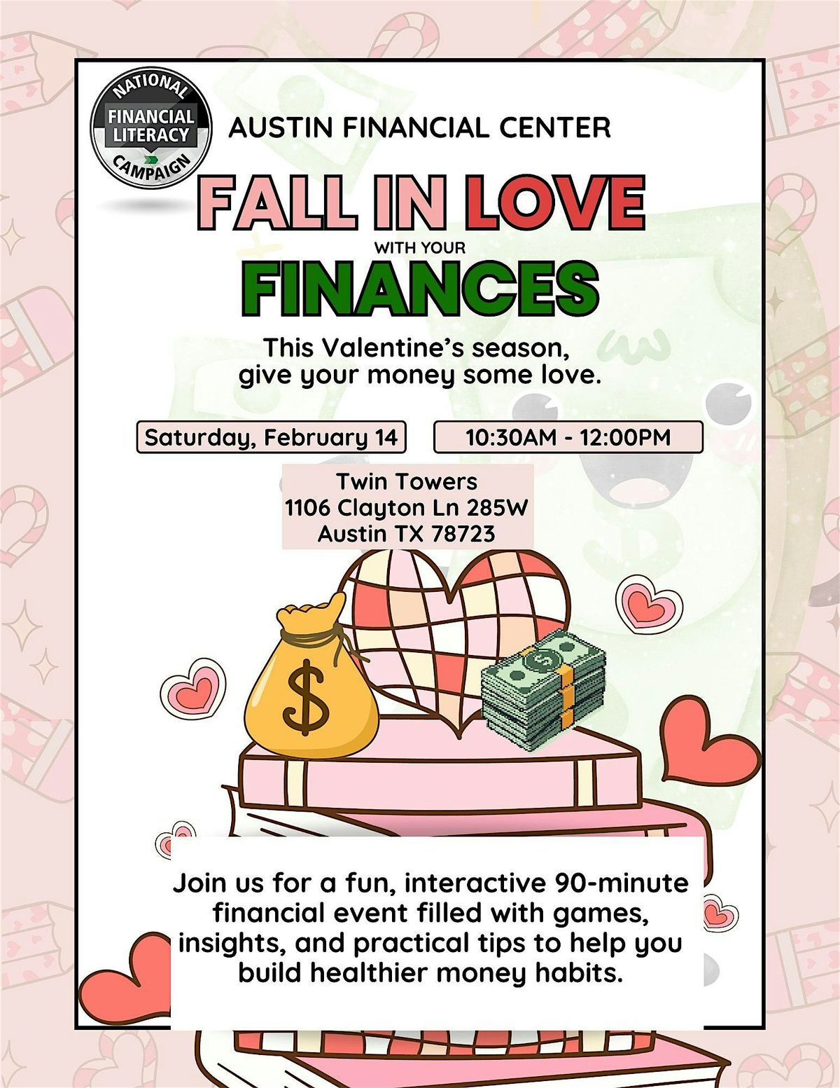 Ready to get up close and personal with your money? Join us for an in-person event where we'll dive into fun, practical tips to help you fall in love with your finances. Whether you're a budgeting newbie or just need a financial pick-me-up, this event's got something for everyone. Let’s make managing money feel less like a chore and more like a passion. Can’t wait to see you there!