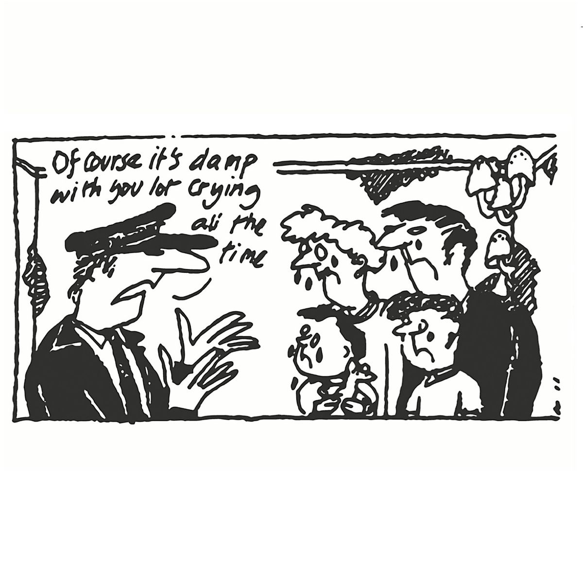Image caption: Cartoons by Brick, early 1970s. Collection: Cathy McCormack archive, Glasgow Women’s Library, brickbats.co.uk. (a black pen cartoon drawing of an official addressing what looks to be like a family, who are crying. With the text 'of course it's damp with you lot crying all the time')