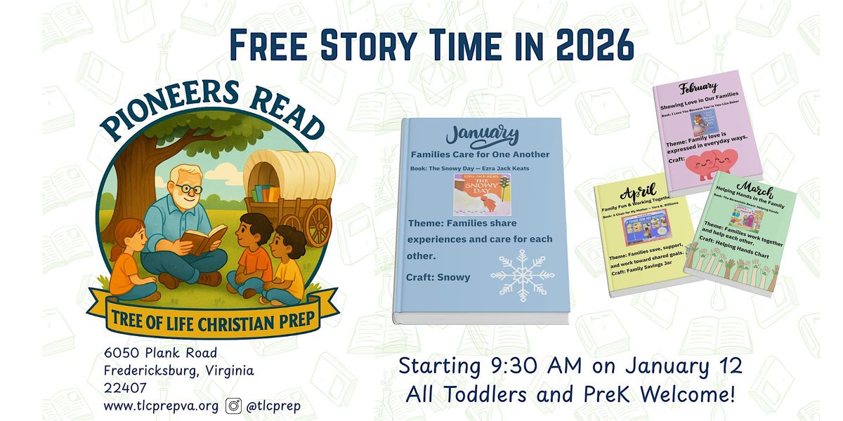 Tree of Life Christian Prep School invites you and your little one to our Pioneers Read story time, a free 30 minute event for toddlers and preschoolers with their grown ups. Join us on Monday, January 12, from 9:30 to 10:00 AM on our Fredericksburg campus for a cozy morning of books and play.