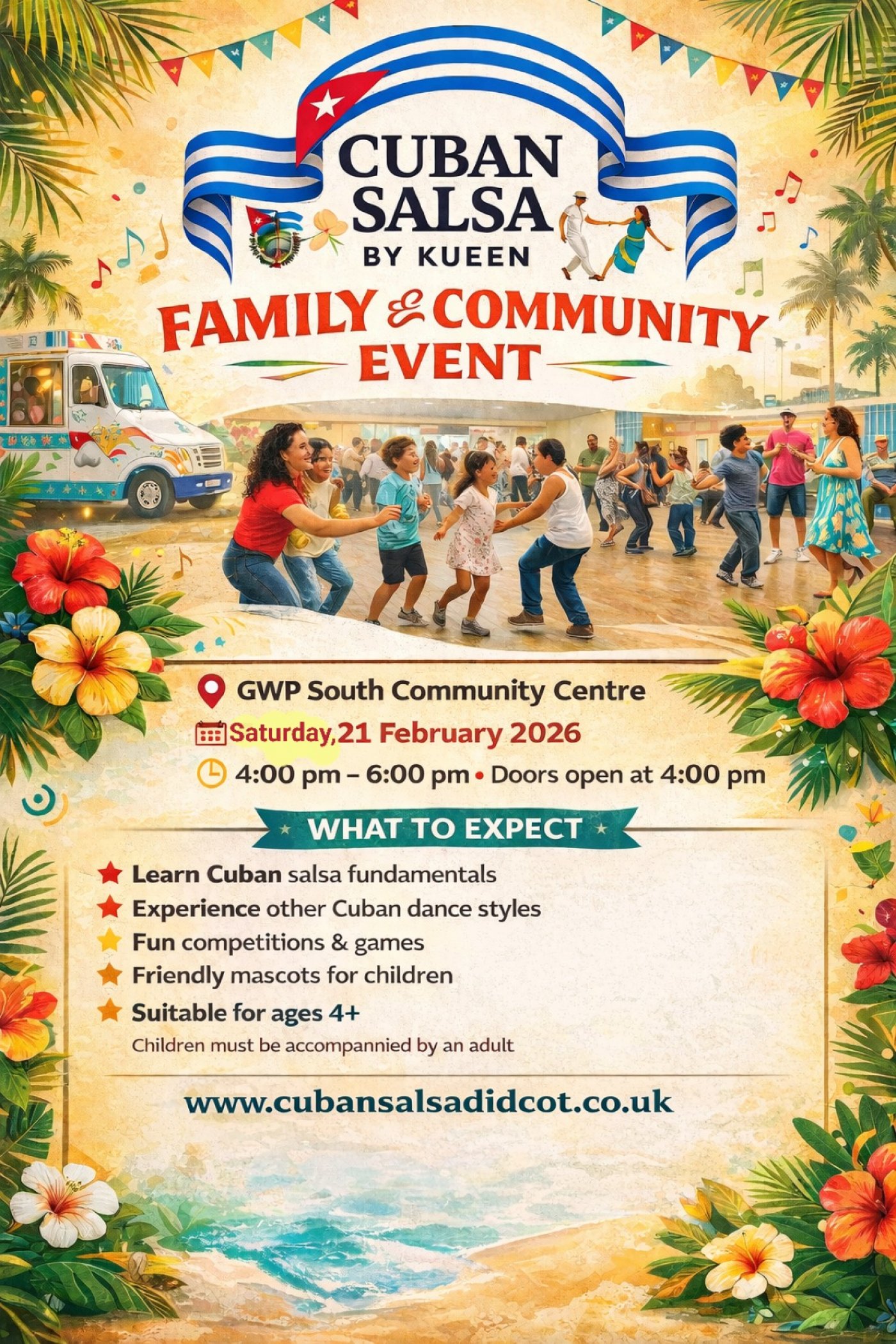 Join us for a joyful Family & Community Cuban Salsa Event, open to everyone aged 4+. This fun and inclusive afternoon brings families and the local community together to move, laugh, and connect through music and dance.