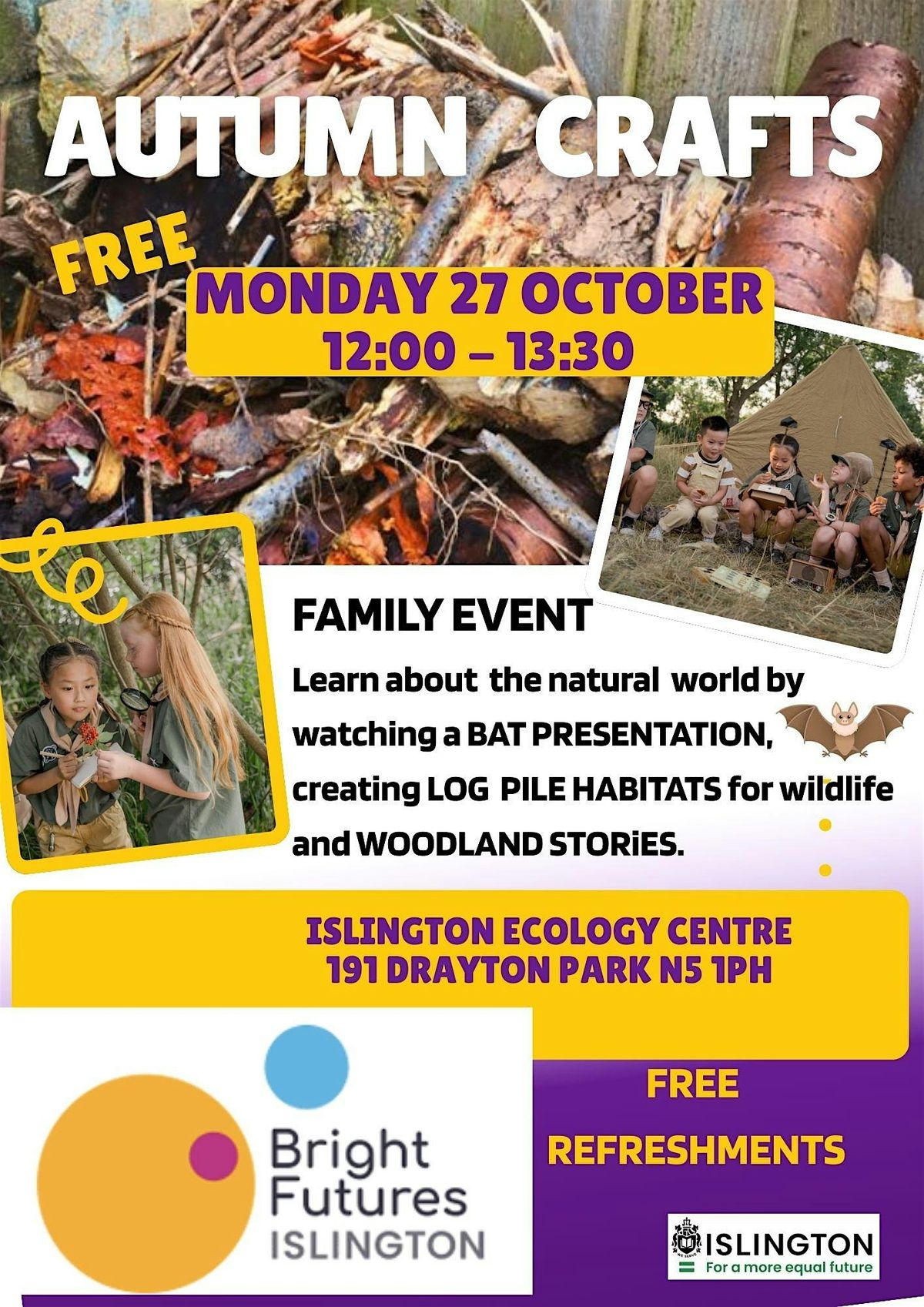 Come join us for a nature-filled day of autumn at the Islington Ecology Centre! Let's celebrate the season learning about bat hibernation and doing hands on outdoor activities inspired by autumn. This event is perfect for families looking to get creative together and enjoy the crisp autumn air. This is an opportunity to bond with your loved ones while making memorable crafts. See you there!