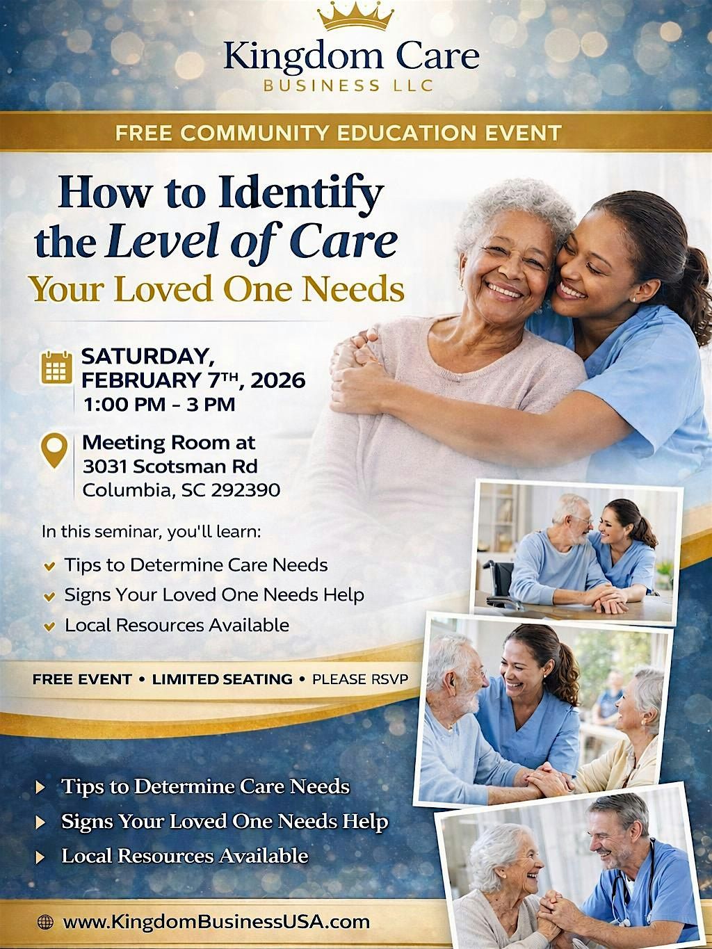 This free educational workshop is designed to help families recognize early signs that a loved one may need caregiving support. Hosted by Kingdom Care Business LLC, the event provides practical guidance, caregiver education, and helpful resources in a small-group setting. Attendees will gain insight into physical, emotional, and daily living changes to watch for and learn how early support can improve safety and quality of life. Educational materials and community resources will be provided.