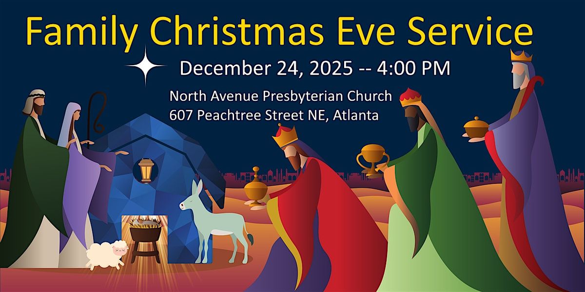 Join us at North Avenue Presbyterian for our Family Christmas Eve Worship Service, beginning at 4pm on Christmas Eve. It will be a joyful celebration of Christ's birth designed with families and kids in mind! Experience the story of Christmas through inspiring music, scripture, storytelling, and fun, as we come together to share the wonder of this special night. Free parking in the church parking lot, which can be accessed from Peachtree Street or Courtland Street.