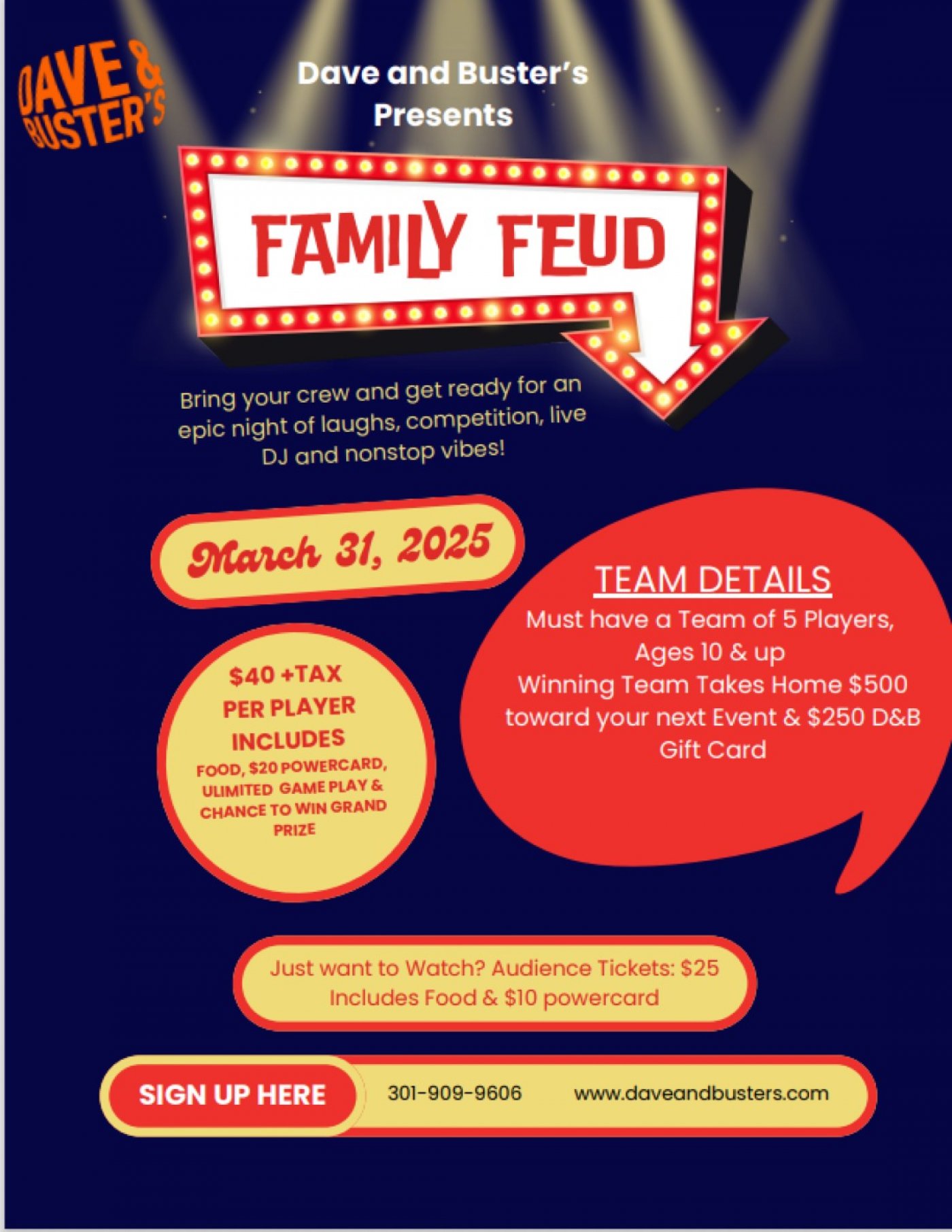$200 per team (includes Food, $20 dollar Power Card with Unlimited Game Play, and your chance to win grand prize)