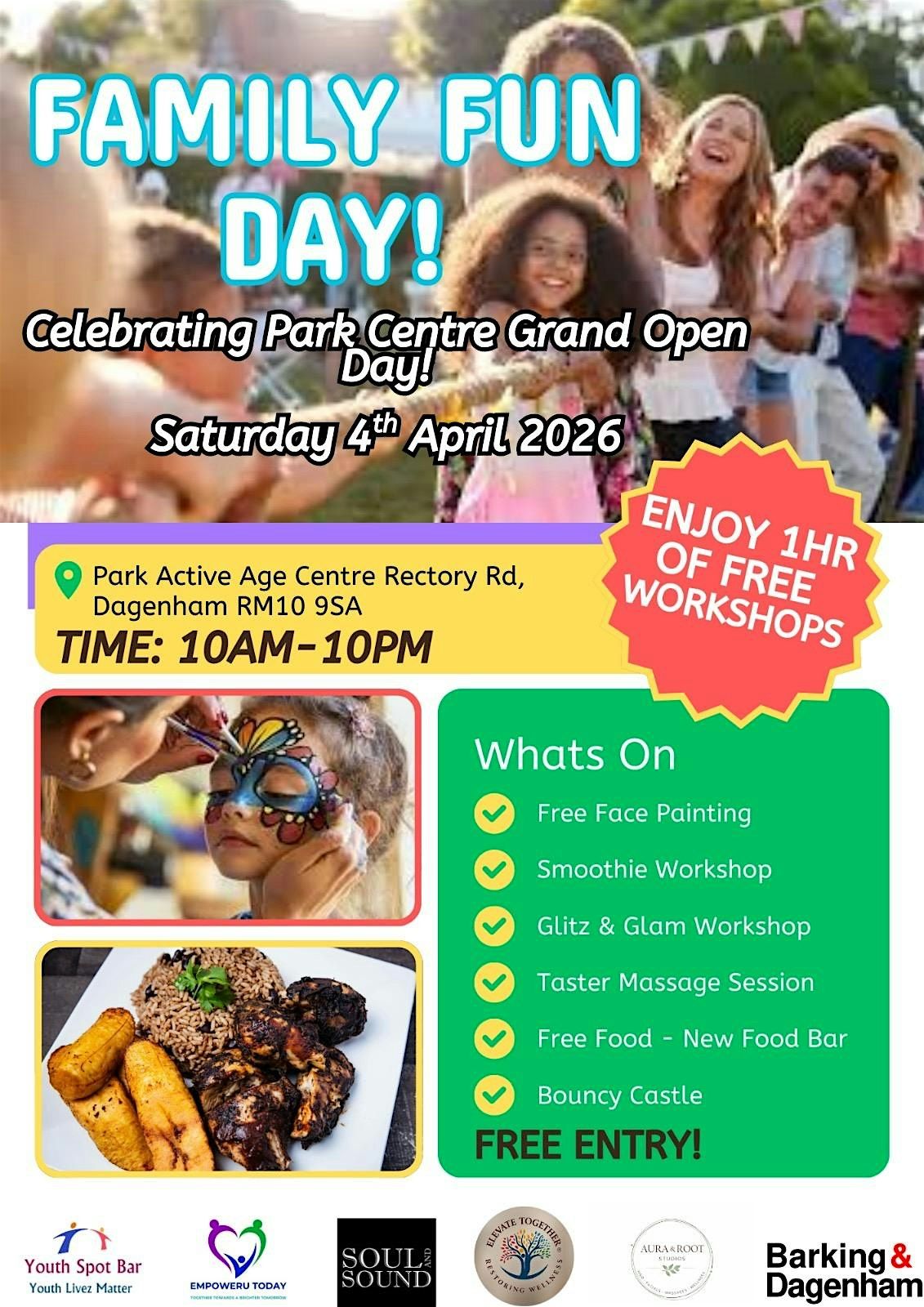 Come join us for a day filled with excitement and joy at Park Active Age Centre! Our Family Fun Day, is the perfect opportunity for families to bond and create lasting memories together. Enjoy free face painting, smoothie workshops and glitz and glam sessions where creativity shines. Experience live performances throughout the day, indulge in free delicious food from our brand new food bar, and let the kids bounce to their hearts' content on our bouncy castles. With fun activities, entertainment, and surprises around every corner, it's the perfect way to spend the day with family and friends. Come along, join the festivities, and help us celebrate this exciting new chapter- it's a day you won't want to miss!