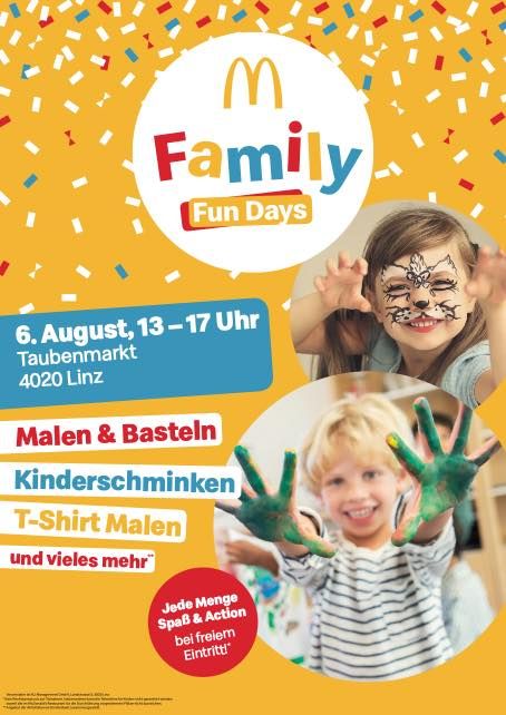 Spass und Action für die ganze FamilieMit dem McDonald’s Family Fun Day bieten wir euch eine tolle Veranstaltung in unserem Restaurant. Freut euch auf einen fantastischen Tag und tobt euch bei lustigen Aktivitäten, kreativen Spielen und sportlichen Abenteuern so richtig aus! Ob Kinderschminken, Bastel- und Mal-Spaß u.v.m., an diesem Tag ist für Riesenspaß gesorgt. Bei freiem Eintritt laden wir euch, liebe Kinder mit euren Familien in unser Restaurant ein.