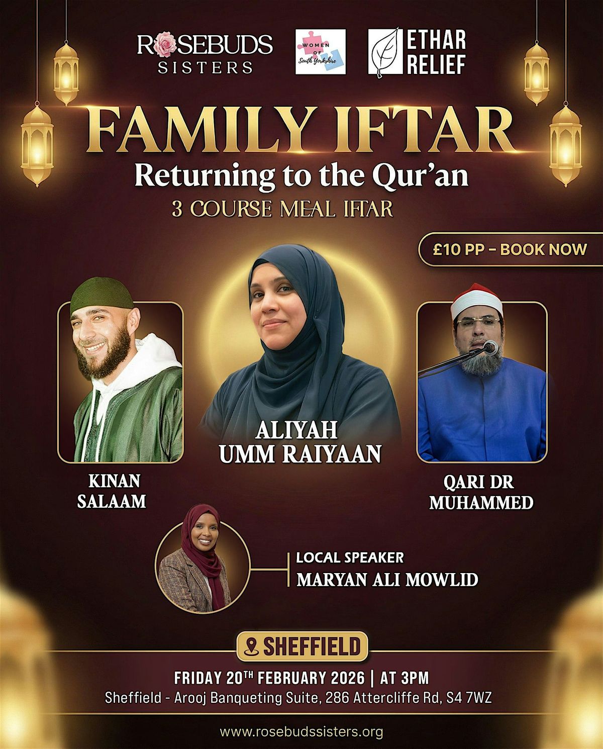 Rosebud Sisters, supported by Ethar Relief and Women of South Yorkshire, invite you to an uplifting evening of faith, reflection, and community. Be inspired by an incredible line-up including Aliyah Umm Raiyaan (Sunday Times Bestselling Author), Kinan Salaam, a moving Muslim spoken-word poet, Qari Dr Muhammed with beautiful Qur’an recitation, and our wonderful local speaker Maryan Ali Mowlid.