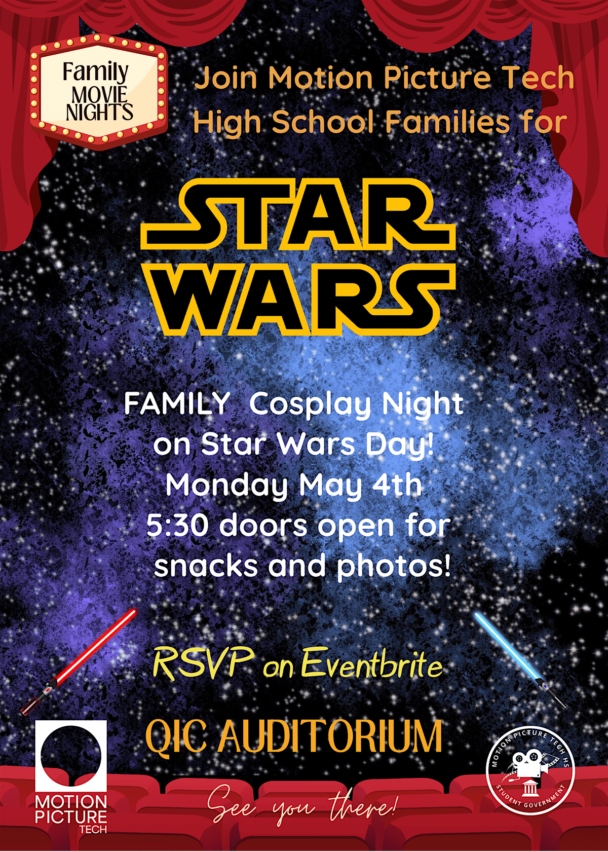 Family STAR WARS Cosplay Movie Night! MAY THE 4TH BE WITH YOU! Join MPT families in your Star Wars costumes for food, folks and fun!