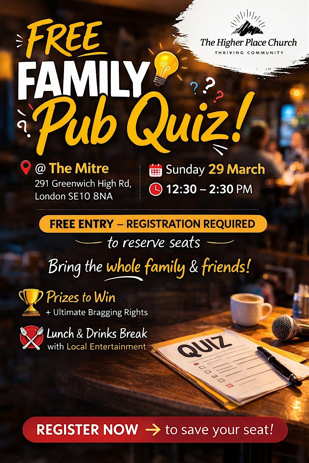Join the Greenwich/Charlton Life Group for a FREE Family Pub Quiz at The Mitre, Greenwich. Prizes, lunch break & local entertainment.