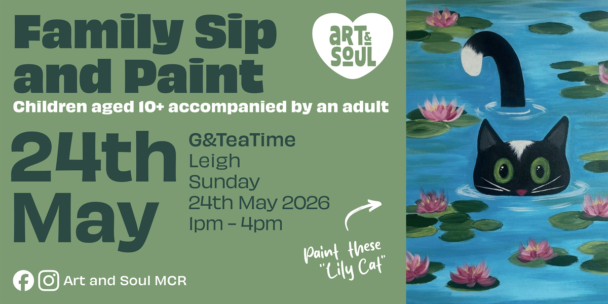 Bring the whole family along for a very special Family Sip & Paint at G&TeaTime, Leigh on Sunday 24th May 2026, 1:00pm – 4:00pm (please arrive at 12:45pm, ready to paint at 1:00pm).