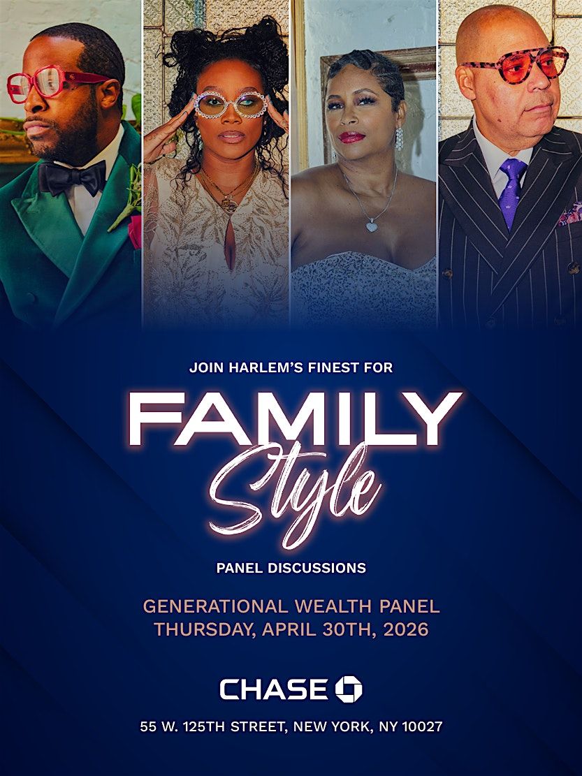 Join us for an impactful series of panel discussions at the intersection of culture, community, and commerce. Family Style , the podcast of Harlem’s legendary #TheFirstFamilyOfFashion , Harlem Haberdashery, and Chase Bank have teamed up to host a panel residency designed to amplify the voices of Harlem and inspire collective prosperity.