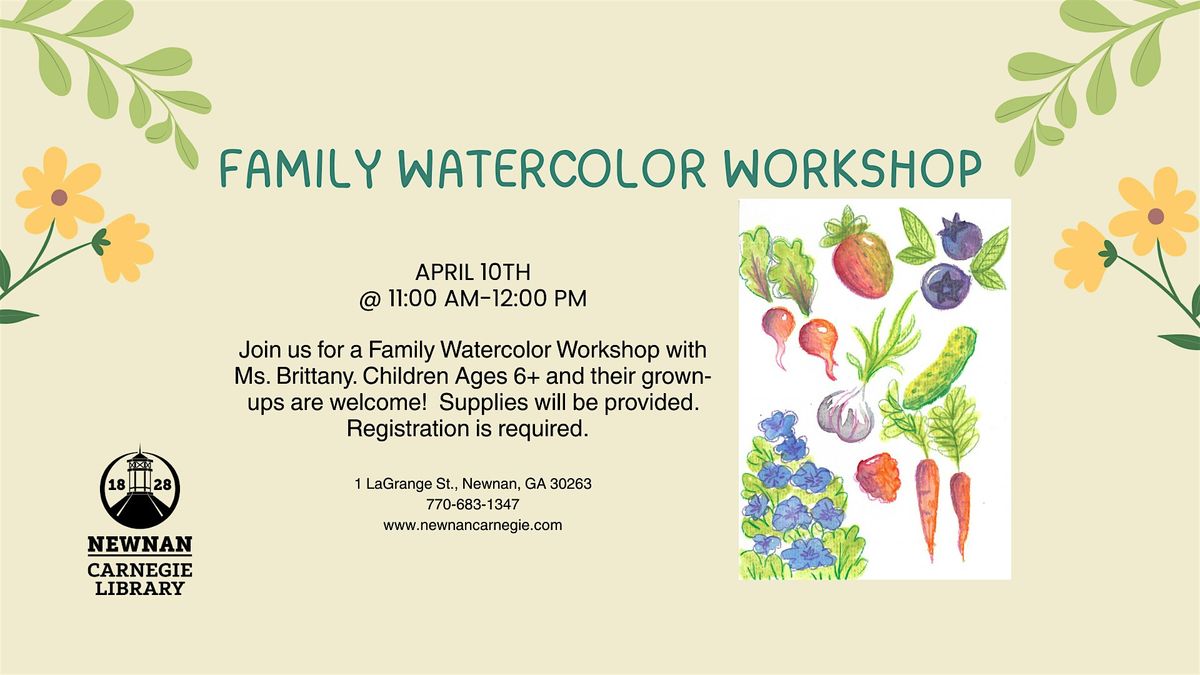 Join us for a Family Watercolor Workshop with Ms. Brittany. Children Ages 6+ and their grown-ups are welcome! Supplies will be provided. Registration is required.