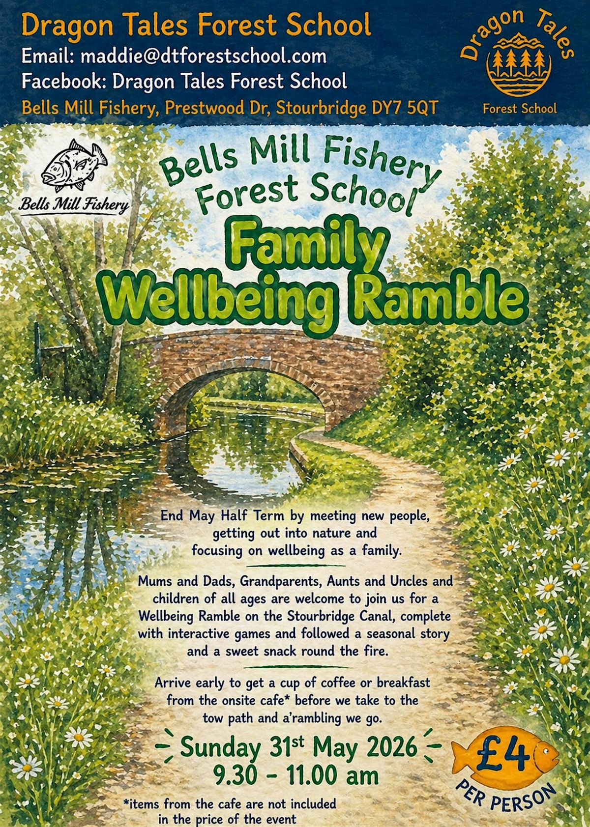 Mums and Dads, Grandparents, Aunts and Uncles and children of all ages are welcome to join us for a Wellbeing Ramble on the Stourbridge Canal, complete with interactive games and followed a seasonal story and a sweet snack round the fire.