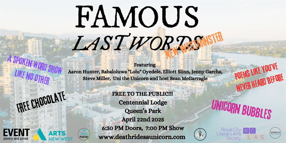 Famous Last Words is a spoken word comedy show that involves poets participating in six rounds of a faux competition where they ‘compete' in a series of poetry related events that are in turn, 'judged' by our host (with input from Uni the Unicorn and our audience).