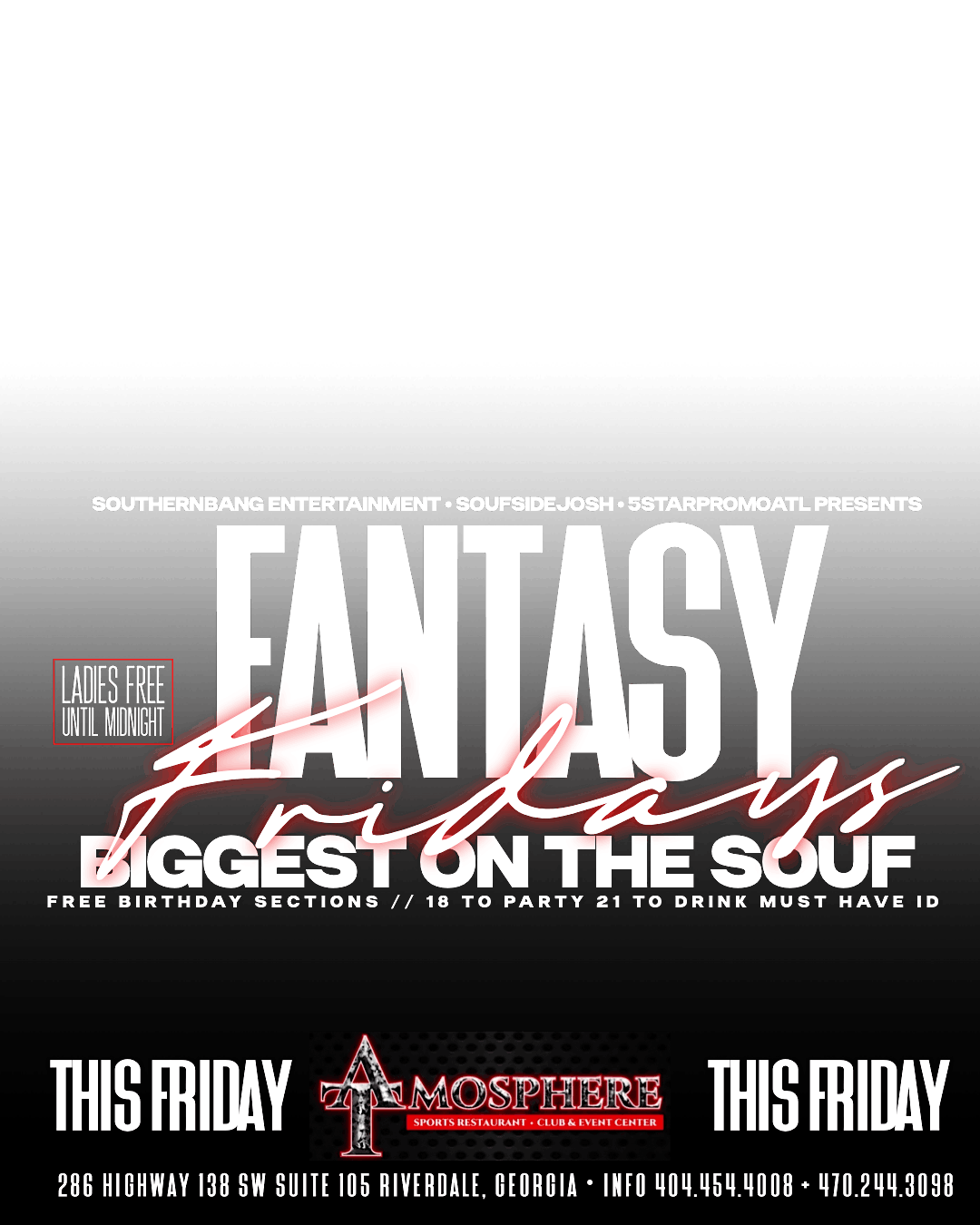 A NIGHT ON THE SOUFSIDE OF METRO ATLANTA FEELED WITH GREAT VIBES FOOD & DRINKS WITH THE HOTTEST DJ PLAYING YOUR FAVORITE HITSAbout this Event