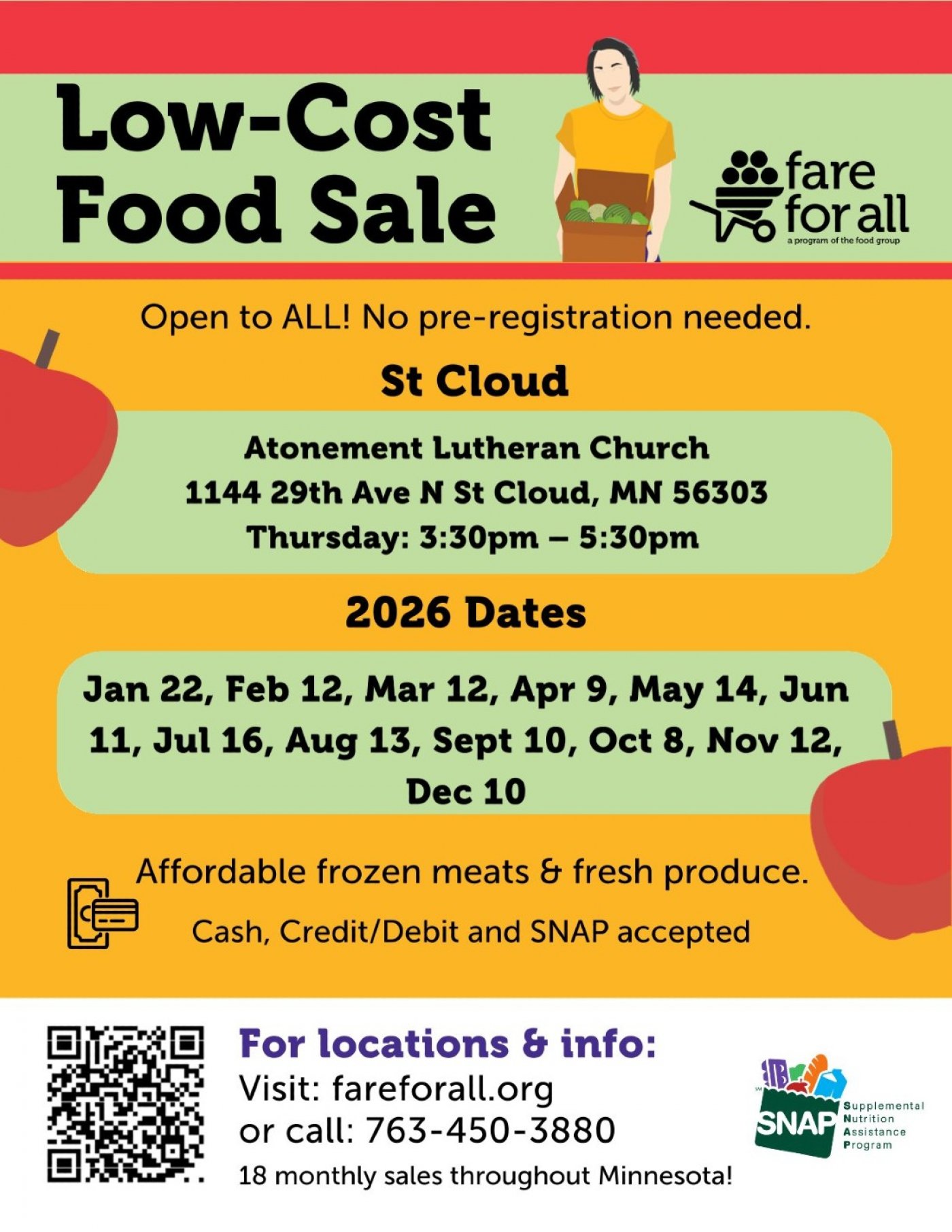 Shop for quality, nutritious foods at discount and budget-friendly prices. We follow a co-op model, so the more people who shop, the better the discounts. Just stop by and shop! Fare For All buys fresh produce and frozen meat in bulk from wholesalers, manufacturers, and growers. Volunteers bundle it into $10 – $35 packages that are sold at sale locations across Minnesota.