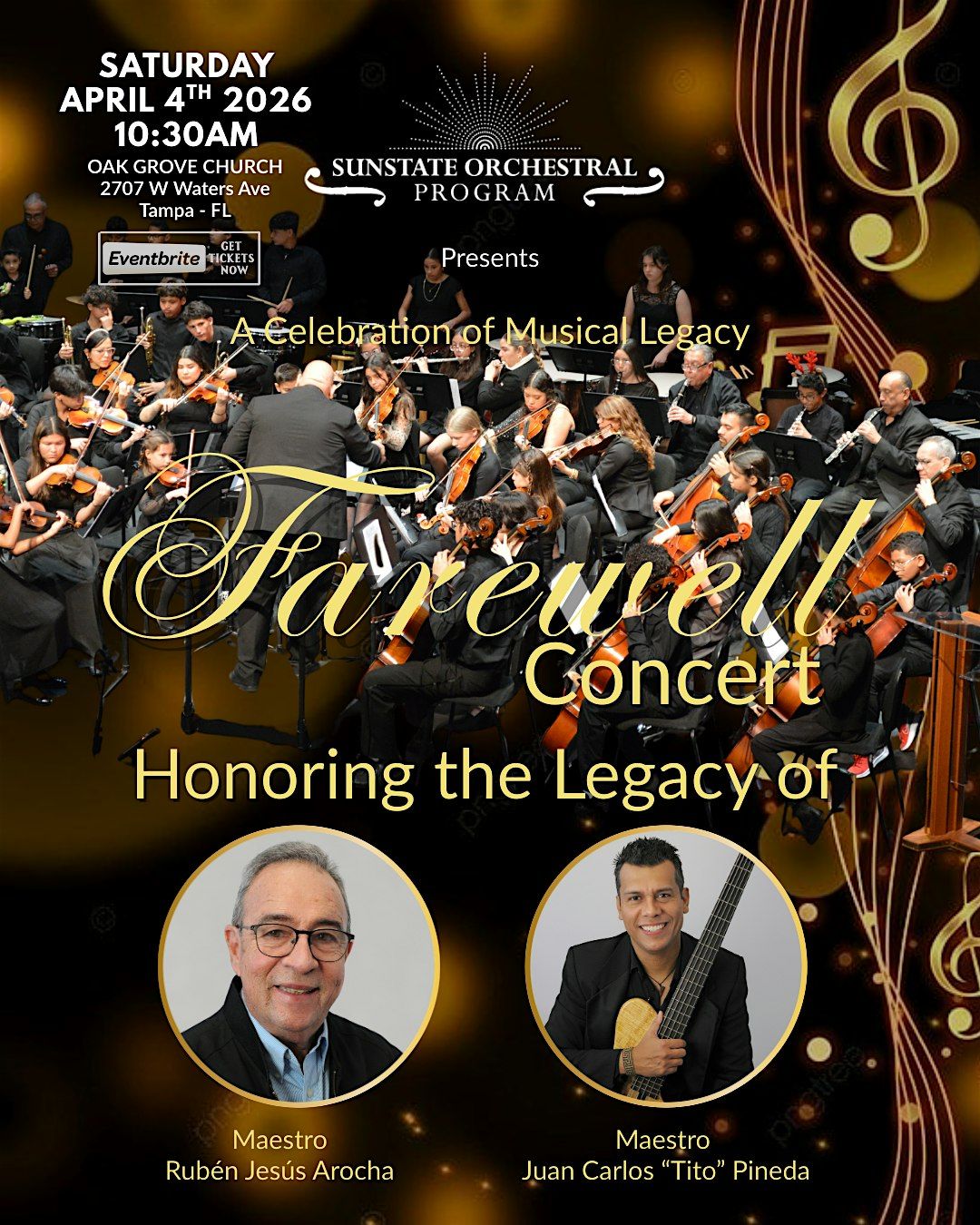 Join us for a very special day as Sunstate Orchestral Program – El Sistema Tampa presents a Farewell Concert honoring the remarkable contributions of Maestro Rubén Jesús Arocha and Maestro Juan Carlos “Tito” Pineda.