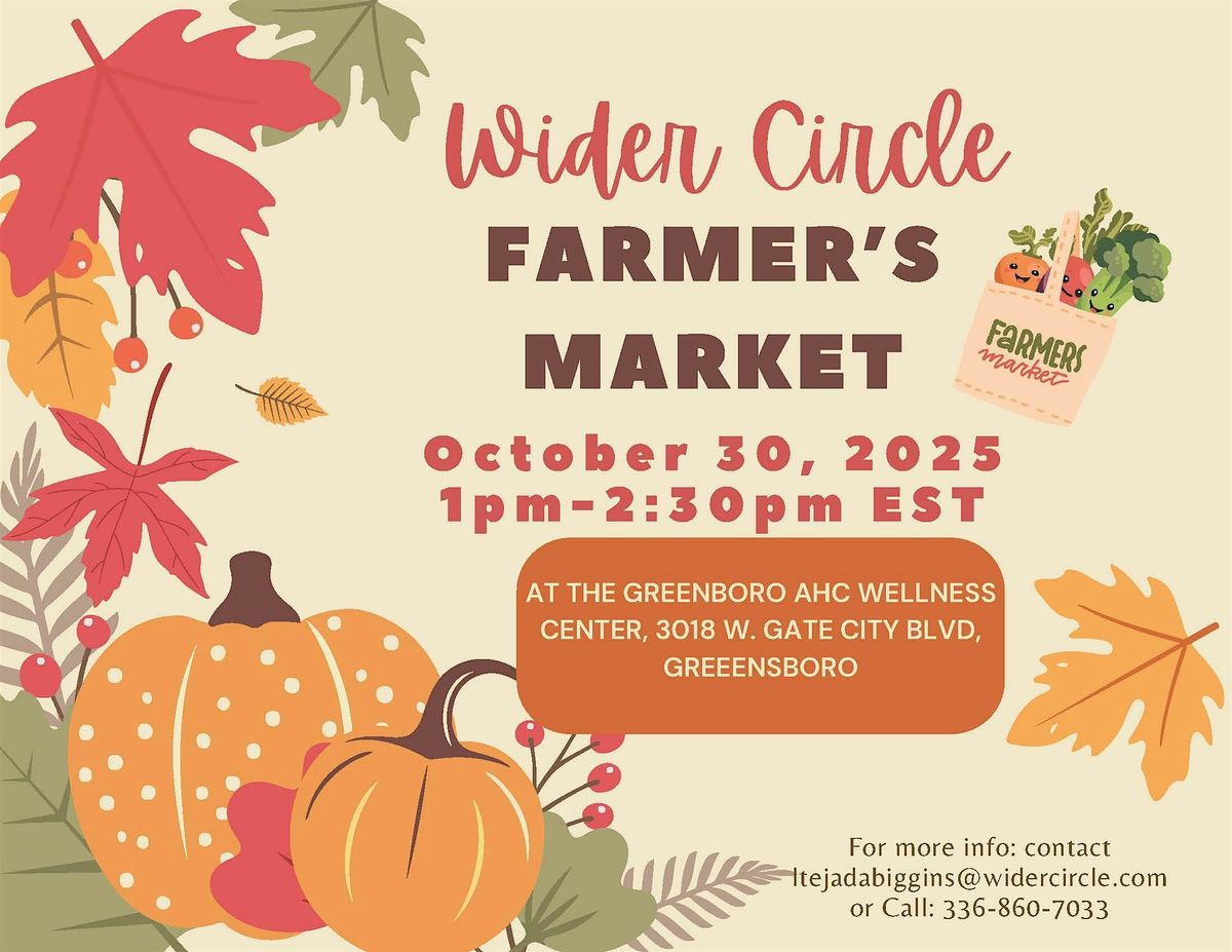 Welcome to the Farmers Market Style - Wider Circle Launch event! This event is for MEMBERS who have AmeriHealth Caritas NC as their insurance carrier. Please join us at the AmeriHealth Caritas North Carolina - Greensboro Wellness & Opportunity Center for a fun-filled day of FREE fresh produce and an introduction to Wider Circle. This in-person event will showcase a variety of goods in a farmers market style setting. We can't wait to see you there!