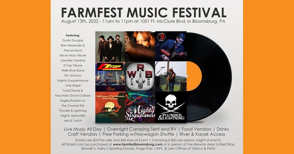 FarmFest is a Bloomsburg, PA music festival featuring some incredible talent from our area. Featuring Berwick Brewery, Food & Craft Vendors, camping on-site with kayak and river access. 2022 Lineup includes: Dustin Douglas, Bret Alexander, Stevie Nicks Tribute (Featuring Jen from Clove, K8, and Bret from the Badlees, EZ Top (ZZ Top Tribute), The Wells River Band, Vine St., The Mighty Susquehannas, The Crooner Kid, Jerk & Twitch, The Eagle Rockers, and many more to come. Tickets are on sale 5/15 and will go fast! $35 pre-sale and $40 on day of event. Camping is just $20 per person for the night of the event. More details at www.farmfestbloomsburg.com