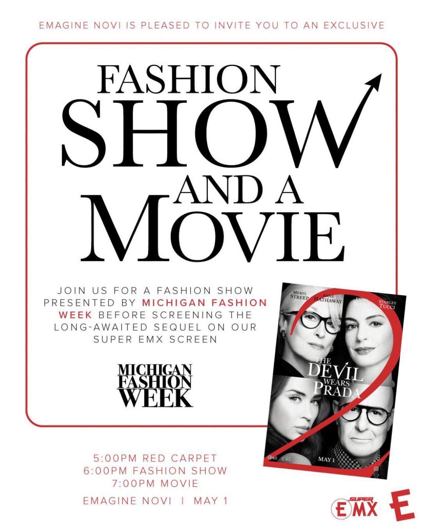 Join us at Emagine Novi for a fashion show presented by Michigan Fashion Week before screening The Devil Wears Prada 2 on the Super EMX screen. Show off your best fashion-forward looks, sip a complimentary cocktail, snack on popcorn, and score limited edition giveaways. The event kicks off at 5:00pm with red carpet photo ops, the fashion show begins at 6:00pm and the feature presentation at 7:00pm.