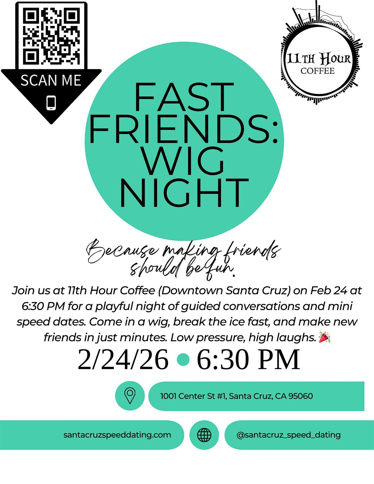 Join us at 11th Hour Coffee (Downtown Santa Cruz) on February 24th at 6:30 PM for a casual, laughter-filled night of guided conversations and mini speed dates—designed just for making new friends. This isn’t about romance or pressure; it’s about showing up in a wig, breaking the ice fast, and connecting with people you might never meet otherwise. Come ready to chat, laugh, and leave with a few new friendly faces in just minutes.