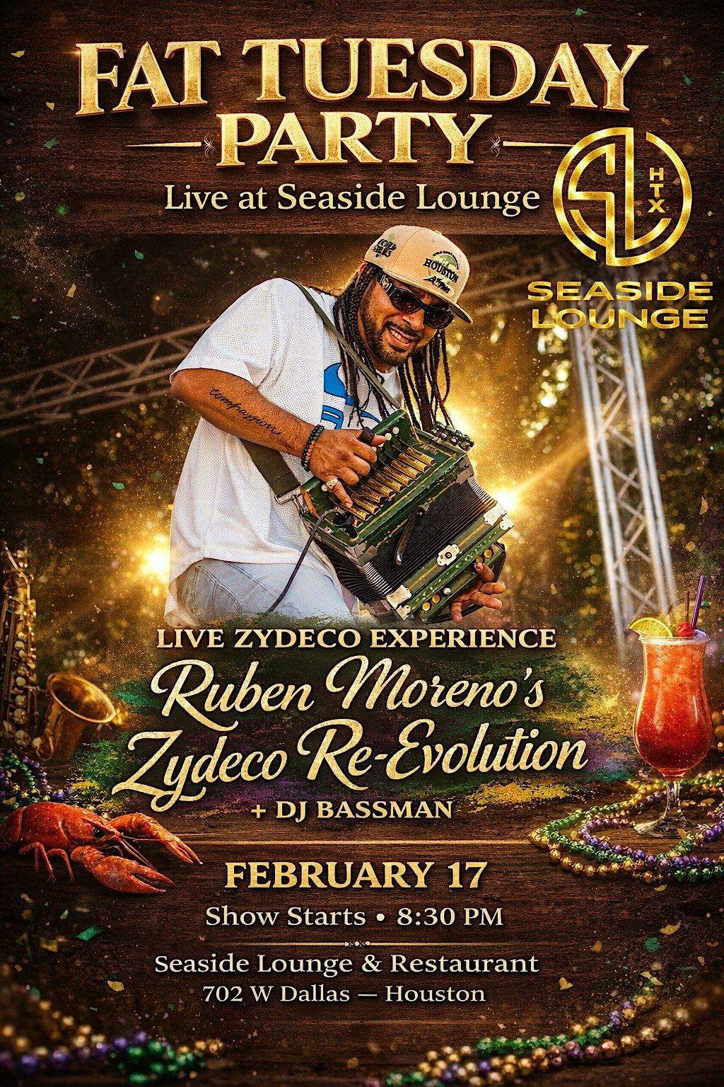 Fat Tuesday at Seaside Lounge Live Music by Ruben Moreno’s Zydeco Re-Evolution ft DJ Bassman