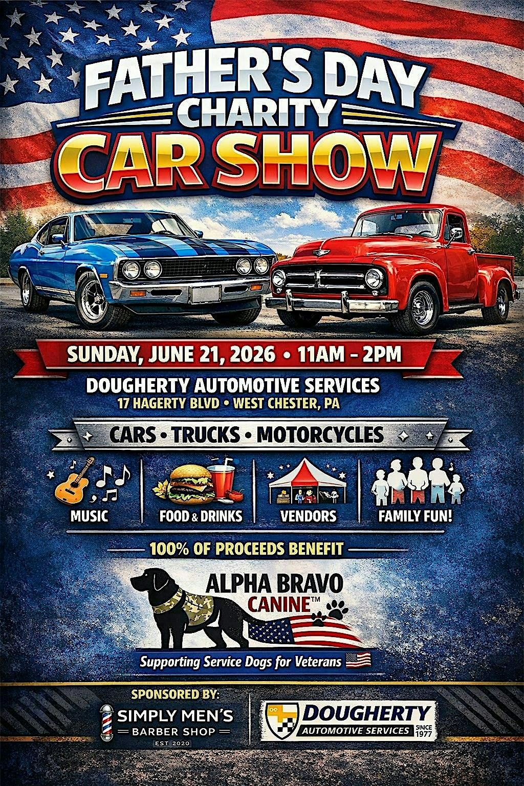 Simply Men's Barber Shop, Dougherty Automotive Services have collaborated to host our 6th Charity Car Show. There will be cars, vendors, Food Truck, music and more. Proceeds will benefit "Alpha Bravo Canine". Come show off your car or be a spectator. We are looking forward to seeing you all there!