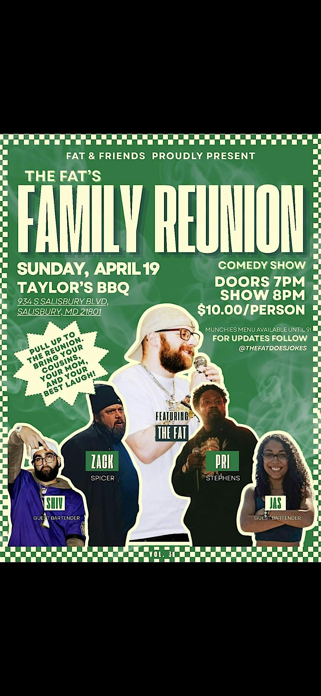 Get ready to catch up and make new memories! The Fat's Family Reunion is a comedy show with comics Zack Spicer, Pri Stephens, and The Fat. A line up of 2 of the best comics around and a man with a family tree that is just not lining up. Bartending the event are the 2 cousins Fat always wanted, Jas and Shiv of Taylors BBQ and Roadie Joes! Bring your appetite and your internal organs and good hat! (The Fat is bald so if everyone wears a hat it'll just really help his comfort levels we really appreciate it)