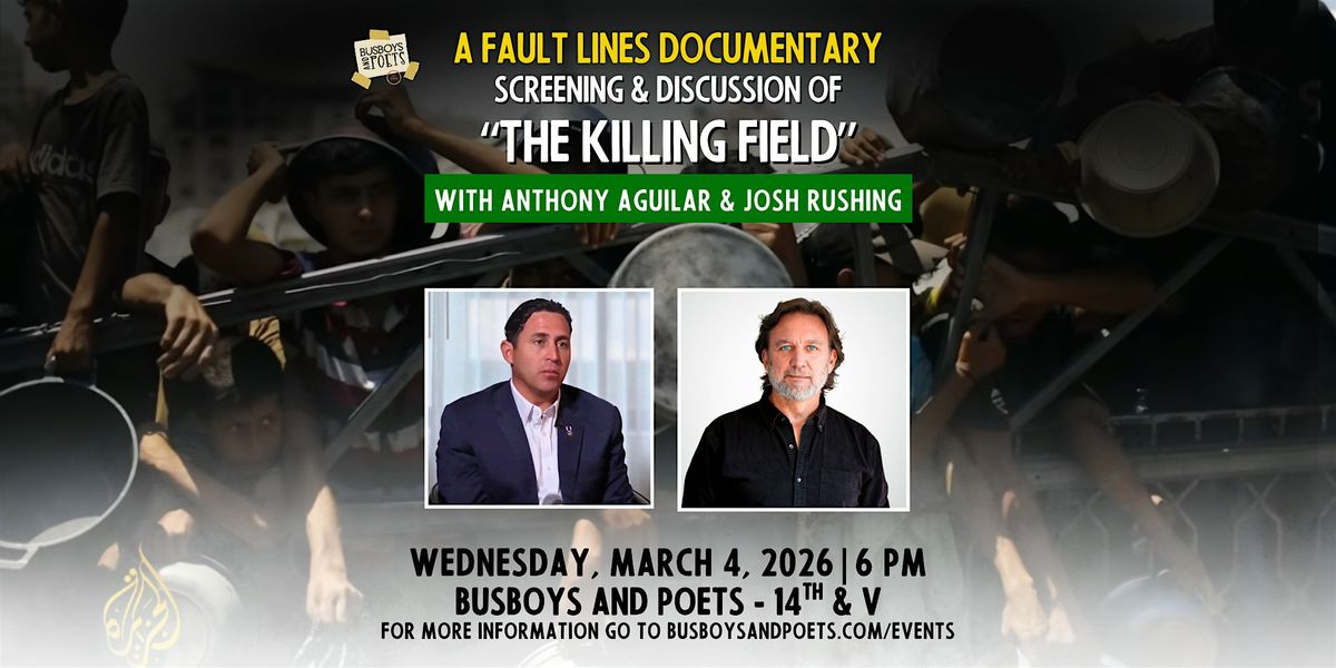 Join Anthony Aguilar and Josh Rushing at Busboys and Poets 14th and V for a screening and discussion of Al-Jazeera's Fault Lines: The Killing Field