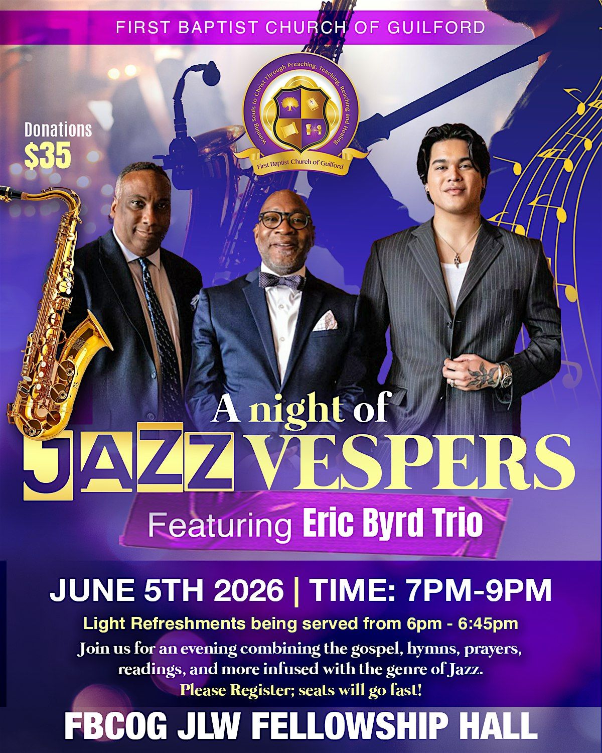 Join us for an evening of hymns, prayers, readings, and more infused with the genre of jazz, featuring the Eric Byrd Trio.