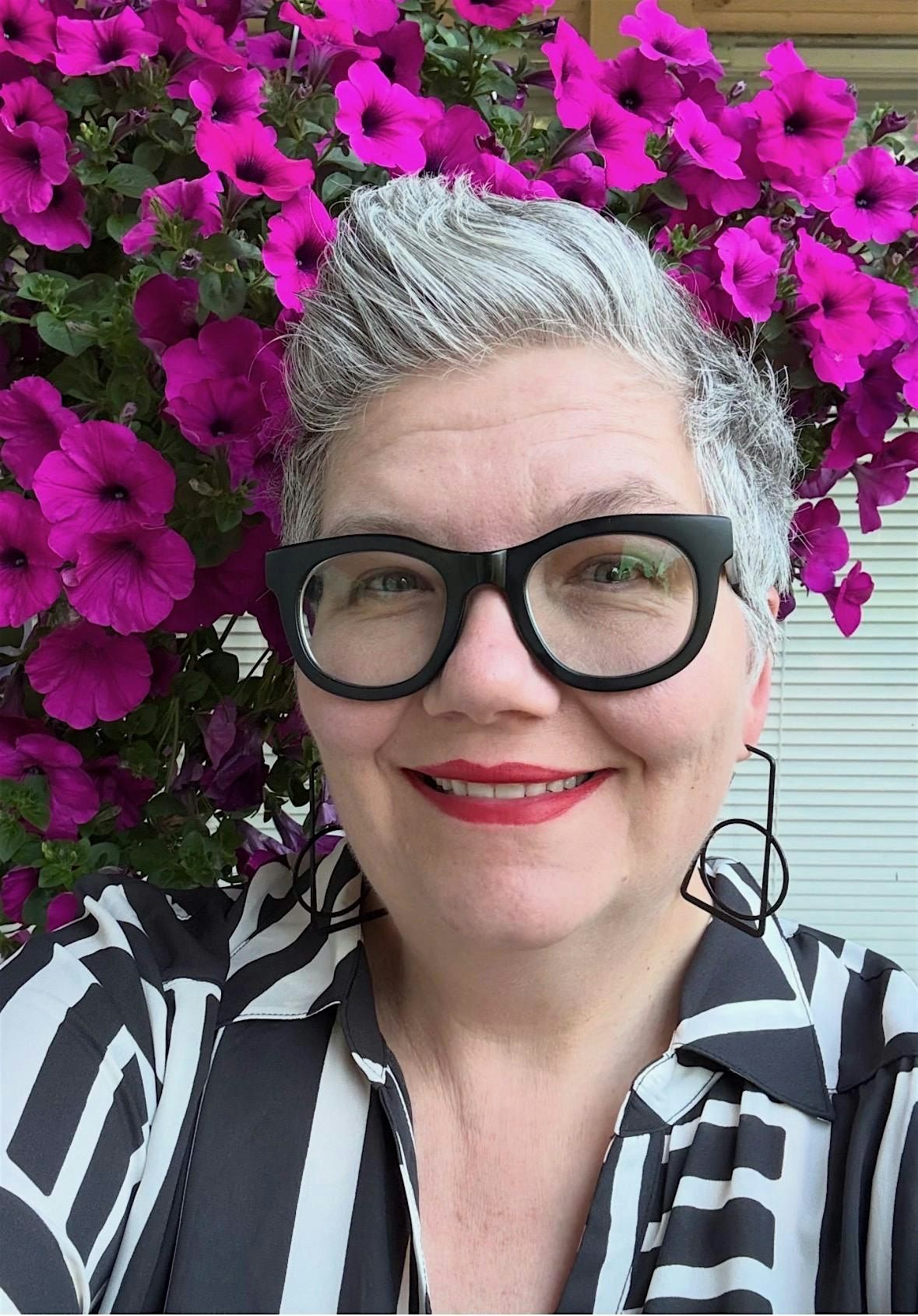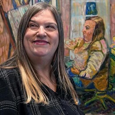 Val Tomich is a self-taught artist who began painting during the pandemic. Her portraits grow out of bold color and layered patterns; she often starts with abstract shapes and marks and lets the patterns guide the image until a face begins to emerge. The figures that develop this way can feel slightly distorted, hinting at the complicated ways we see ourselves and each other.
