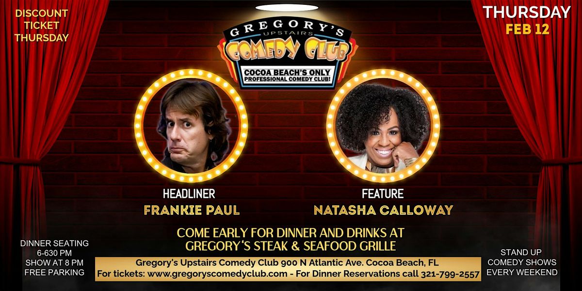 Come see the best touring comedians from all over the country performing every weekend at Gregory's Comedy Club. Enjoy upscale dining with the best local staff Cocoa Beach has to offer! Seating starts 2 hours prior to showtimes. This week nationally touring comedian Frankie Paul headlines! His fun, quirky and relatable style has been a hit all over the country! with South Florida favorite Natasha Naomi Calloway featuring!