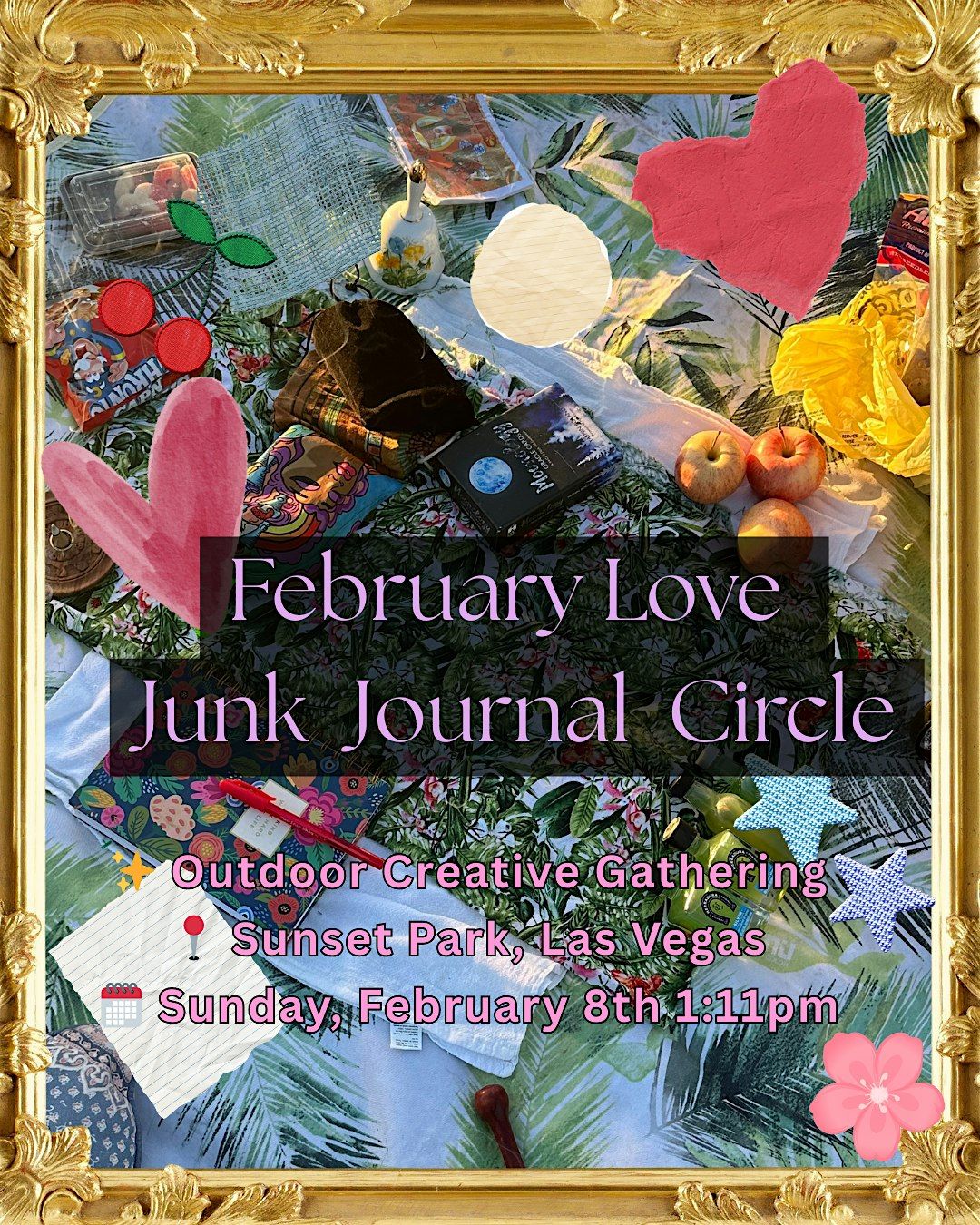 This is a facilitated junk journal circle held in the park — part creative play, part reflection, part community. You’ll be guided through prompts and intention-setting while creating pages that explore love in all its forms: self-love, grief, desire, softness, boundaries, and memory.