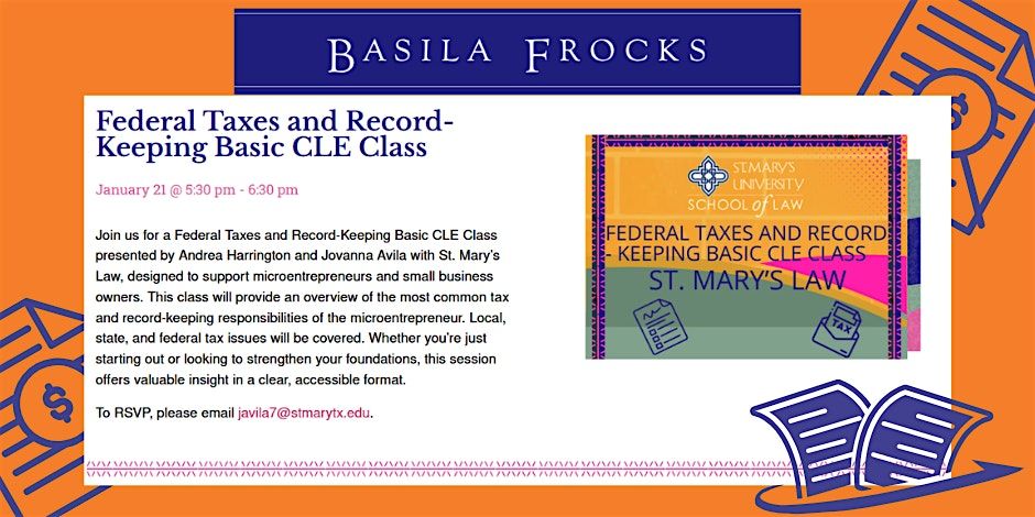 Join us for a Federal Taxes and Record-Keeping Basic CLE Class presented by Andrea Harrington and Jovanna Avila with St. Mary’s Law, designed to support microentrepreneurs and small business owners.