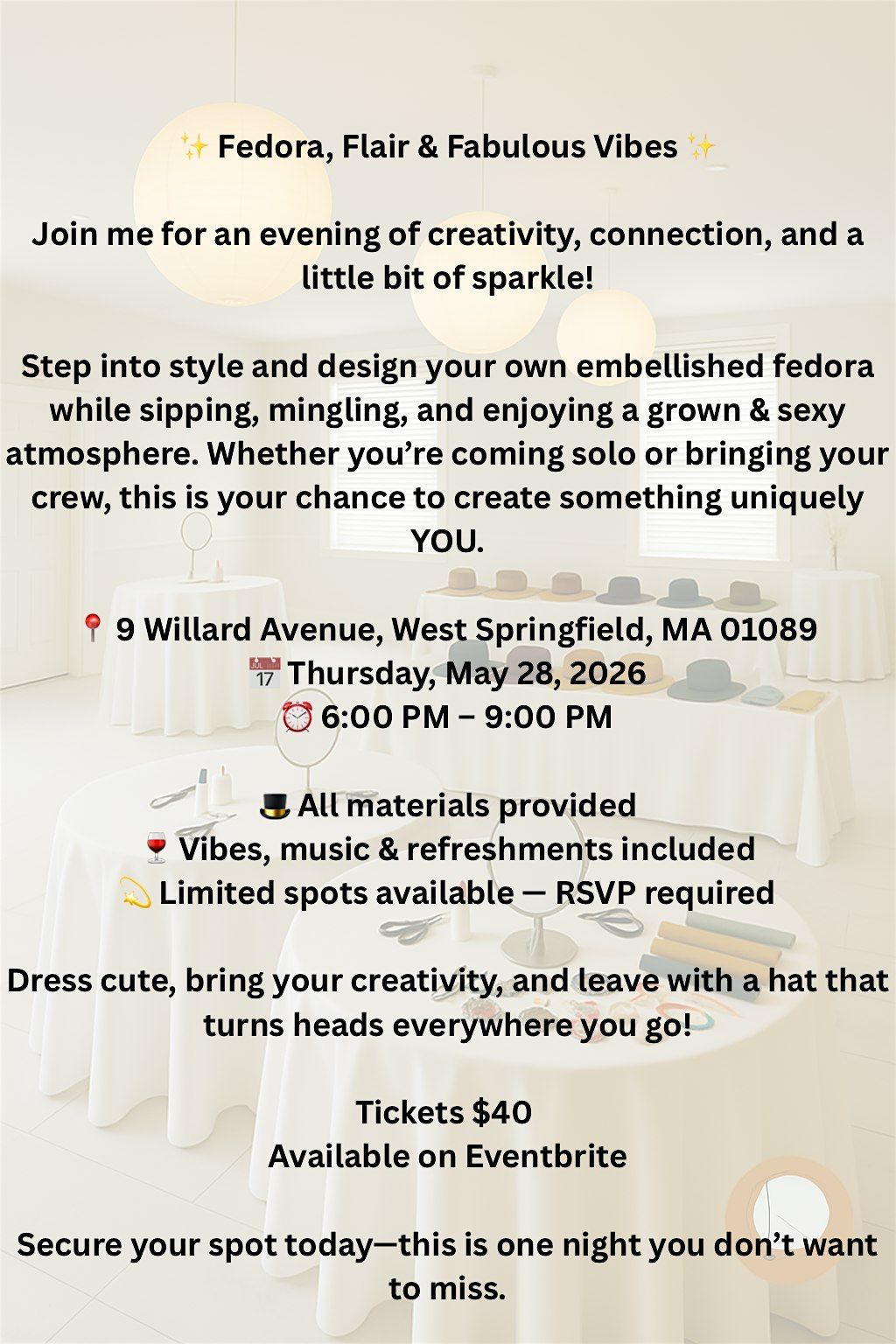 Join us for a fun and creative Fedora Embellishing workshop at 9 Willard Ave! Whether you're looking to jazz up your favorite hat or try something new, this hands-on session is perfect for all skill levels. We'll meet on May 28, 2026 at 6:00 PM (Eastern Time). Bring your ideas and get ready to add some unique flair to your fedora. Can't wait to see you there!