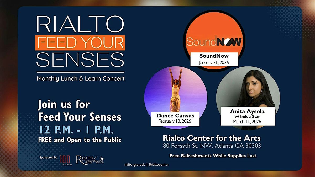 Feed Your Senses is a free monthly lunchtime concert series presented by the Rialto Center for the Arts. Designed as a welcoming midday pause, the series features live performances across music and dance, offering a relaxed and inspiring cultural experience in the heart of Downtown Atlanta. Complimentary refreshments are available while supplies last. RSVP encouraged.