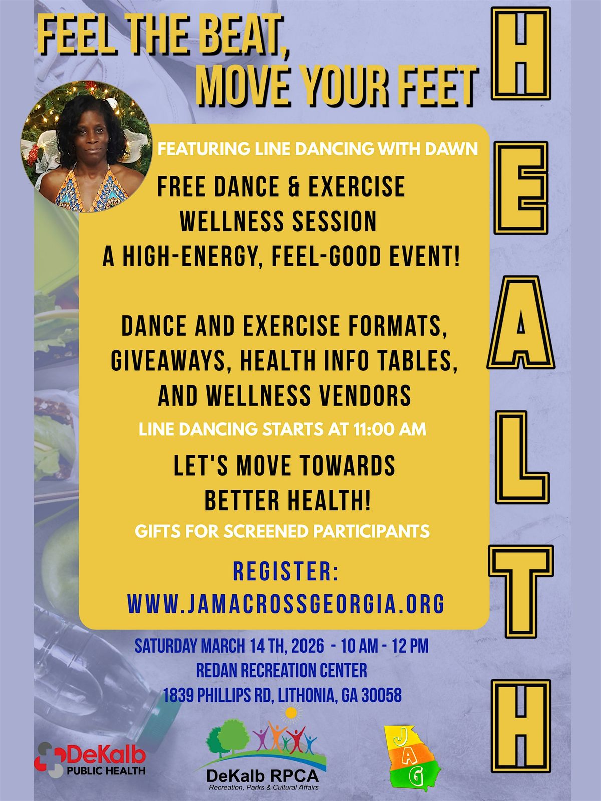 Join us for Feel the Beat, Move Your Feet on Saturday, March 14, a fun, uplifting wellness experience hosted by Jam Across Georgia, in partnership with DeKalb County Public Health and the Redan Recreation Center!