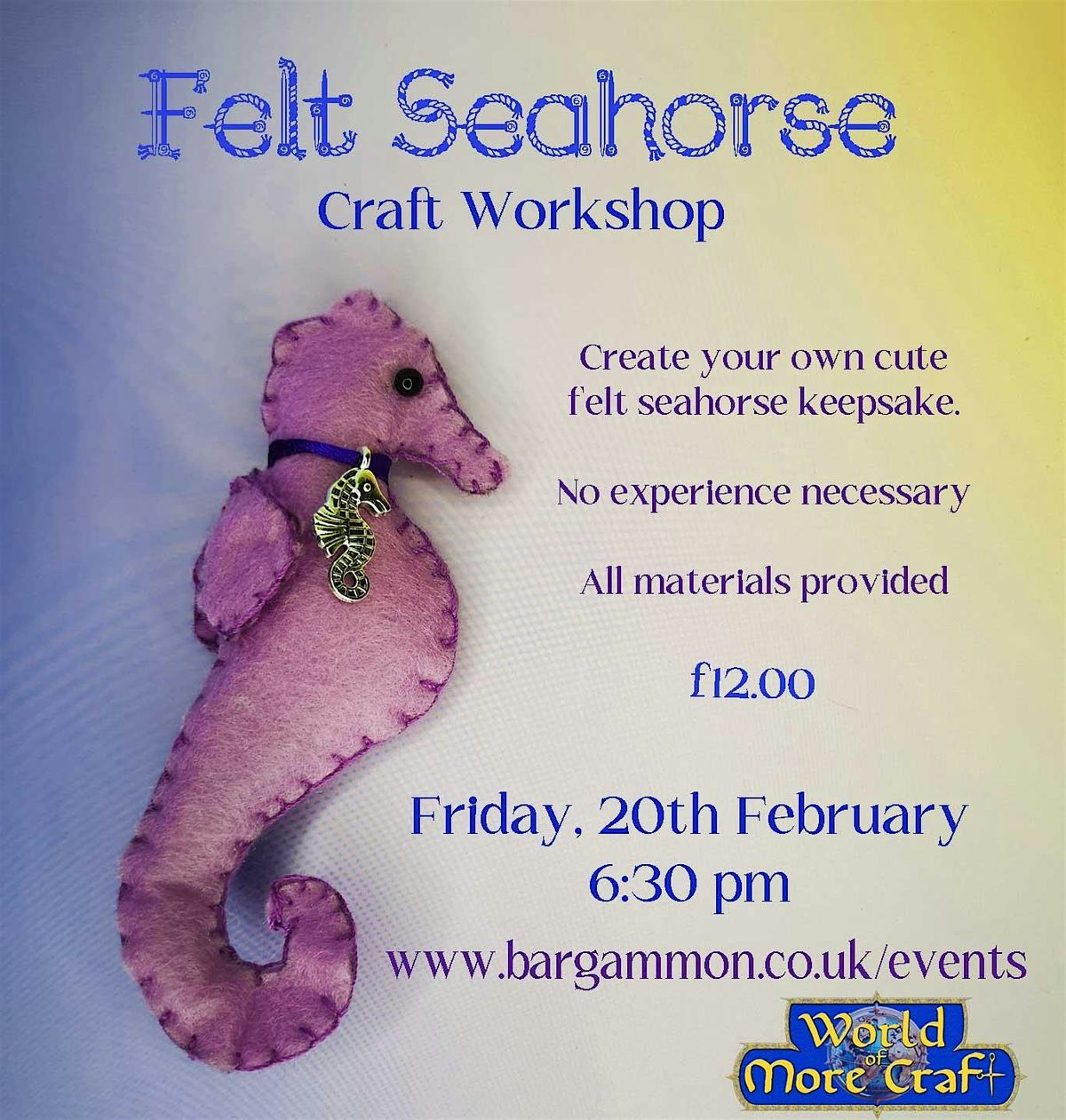Join us for a super fun in-person workshop where you'll learn to create your very own felt sea horse! Perfect for craft lovers and beginners alike, this hands-on session will guide you step-by-step through the process. Bring your creativity and leave with a cute handmade sea horse to show off or gift. Don’t miss out on this awesome crafting experience!