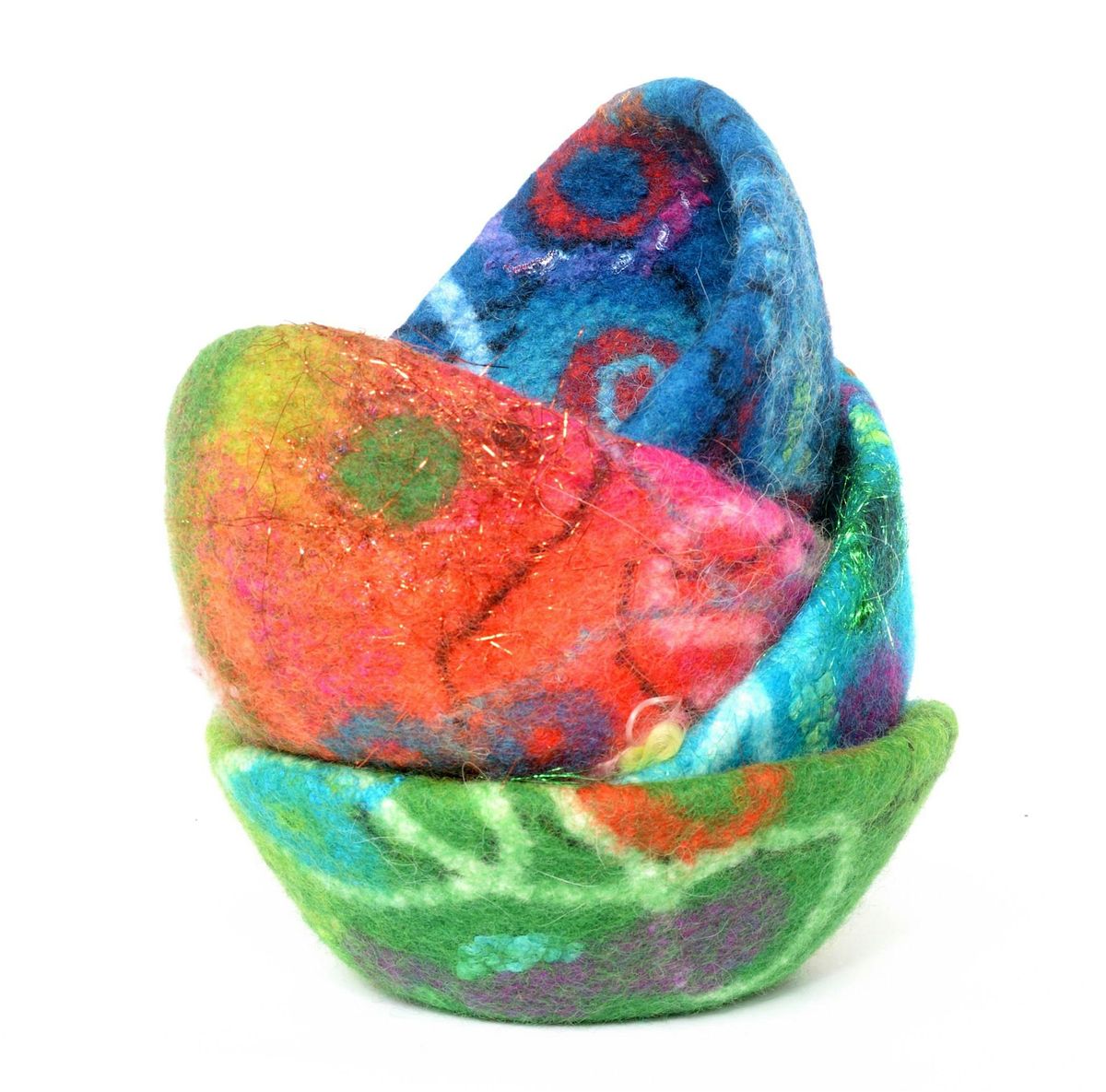 Learn a clever new technique and felt a sturdy bowl to hold your keys, chocolates or simply to brighten up any shelf. Decorate your bowl, inside and out, with colorful bits and pieces of fabric, yarn, silk fabric and more. Please note: some physical stamina need for felting classes.