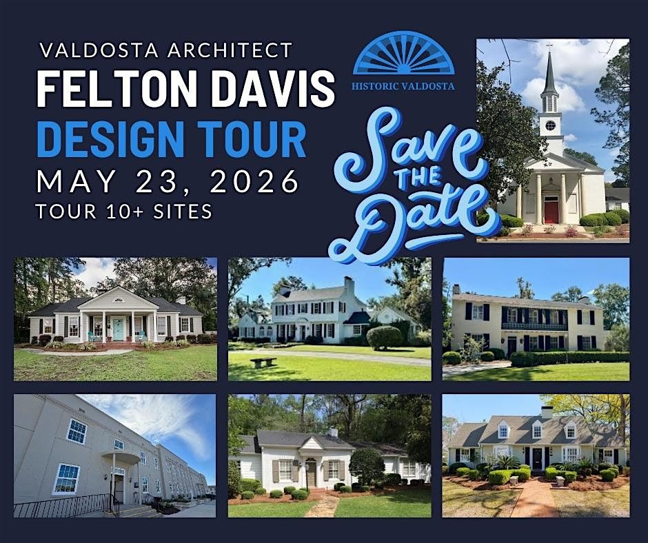 Step inside Valdosta’s architectural history on a special Historic Valdosta Preservation Tour celebrating the work of renowned architect Felton Davis.Guests will have the rare opportunity to visit more than 10 historic homes and commercial spaces designed by Davis, whose work helped shape the character of Valdosta and communities across the region. In addition to his many beautiful local designs, Davis worked throughout the Southeast, including notable projects in Fernandina Beach and at The King and Prince on St. Simons Island.Join us for this unique opportunity to experience the craftsmanship and architectural legacy of one of South Georgia’s most influential designers while helping support local historic preservation projects.