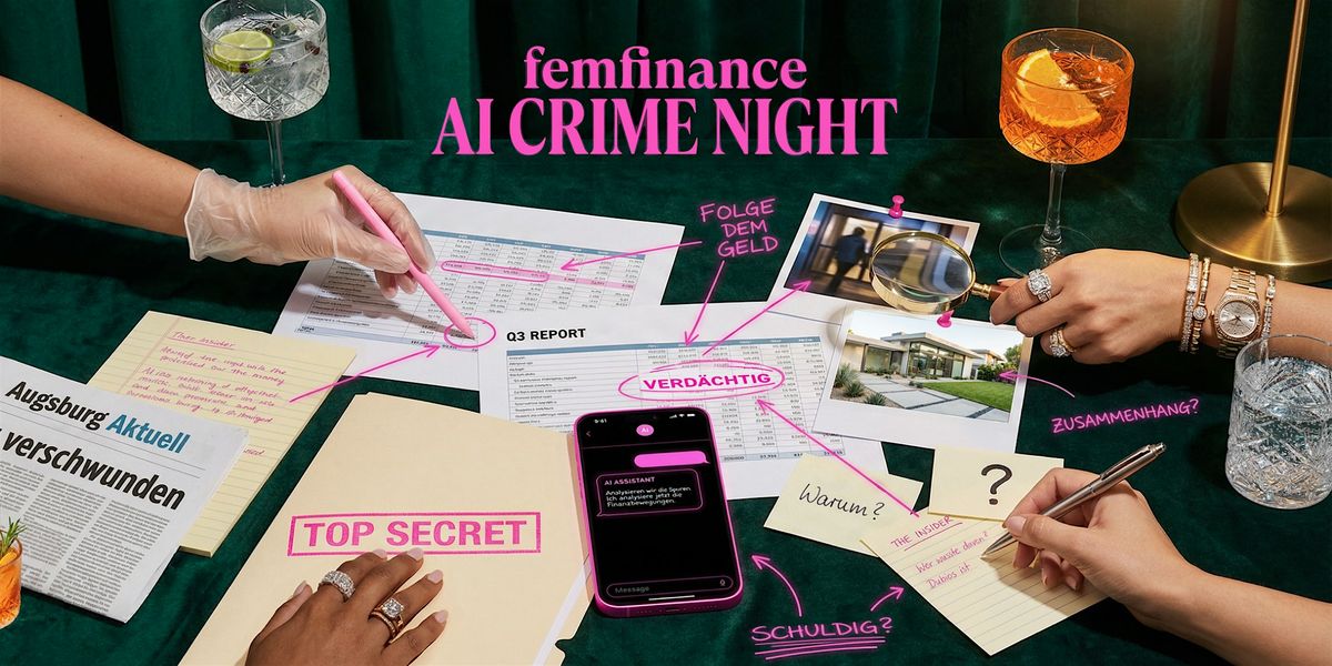 Bei der femfinance AI Crime Night tauchst du in einen interaktiven Kriminalfall des Finanzdezernats AuxCrime ein – und wirst selbst zur KI-Ermittlerin!