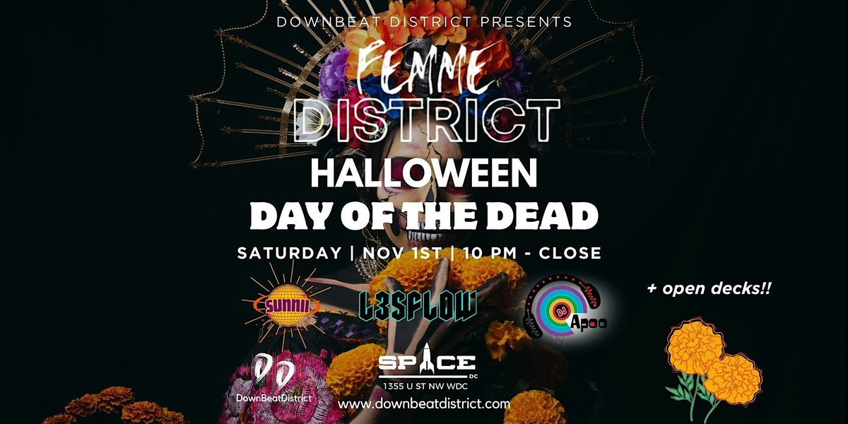 Get ready for Halloween Day of the Dead party Femme District style at Space DC Club on U Street! You can't beat this vibrant neighborhood and we are ready to throw down some good house, tech house, and more! Maybe trance? Come and find out!