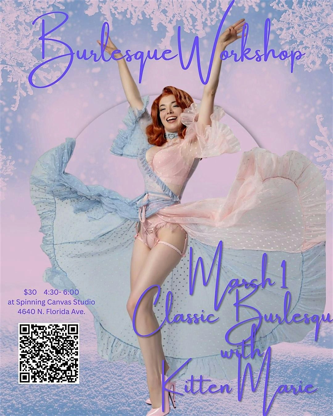 Welcome to Femmes & Follies: Classic Burlesque with Kitten Marie at Spinning Canvas Studio! Get ready for a night of glamour, sass, and seduction on March 1, 2026 at 4:30 PM (Eastern Time). Join us for a dazzling workshop that will transport you to a world of feathers, rhinestones, and allure. Let Kitten Marie teach you with her timeless movements and captivating charm. Don't miss this opportunity to experience the magic of classic burlesque in person!