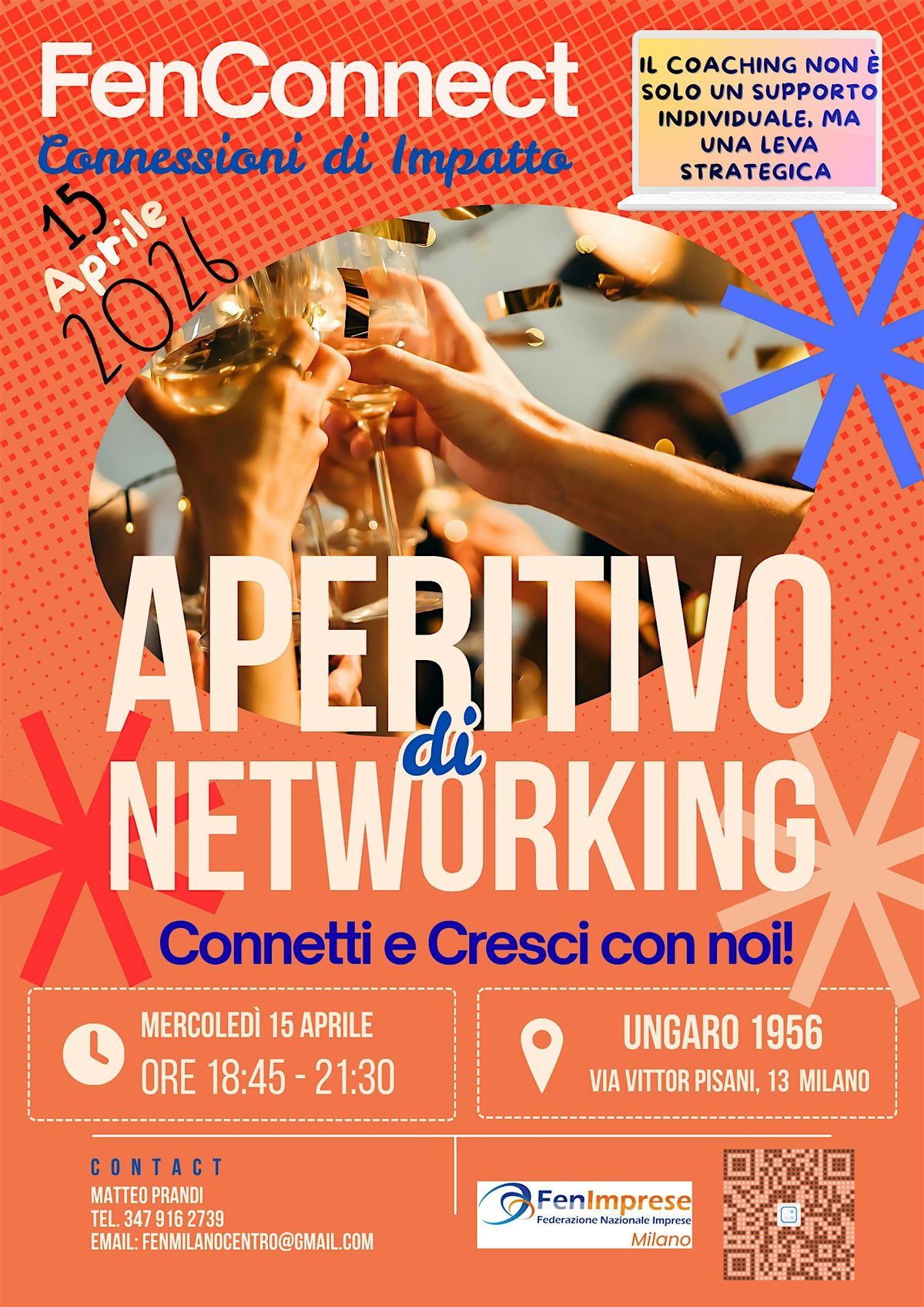 - Welcome & Accoglienza: Un benvenuto informale per rompere il ghiaccio e iniziare a connettersi con la community di FenConnect.