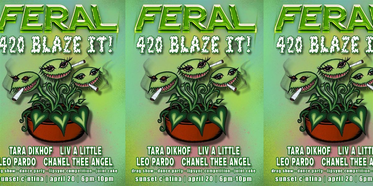 WELCOME TO FERAL 420 BLAZE IT!! A CELEBRATION OF THE HIGH HOLIDAY! COME CHILL, GET STONED, EAT MEXICAN FOOD, SCREAM AT DRAG QUEENS, HIT THE JOINT CAKE, COMPETE IN THE $100 SMOKESHOW LIPSYNC COMPETITION!!!