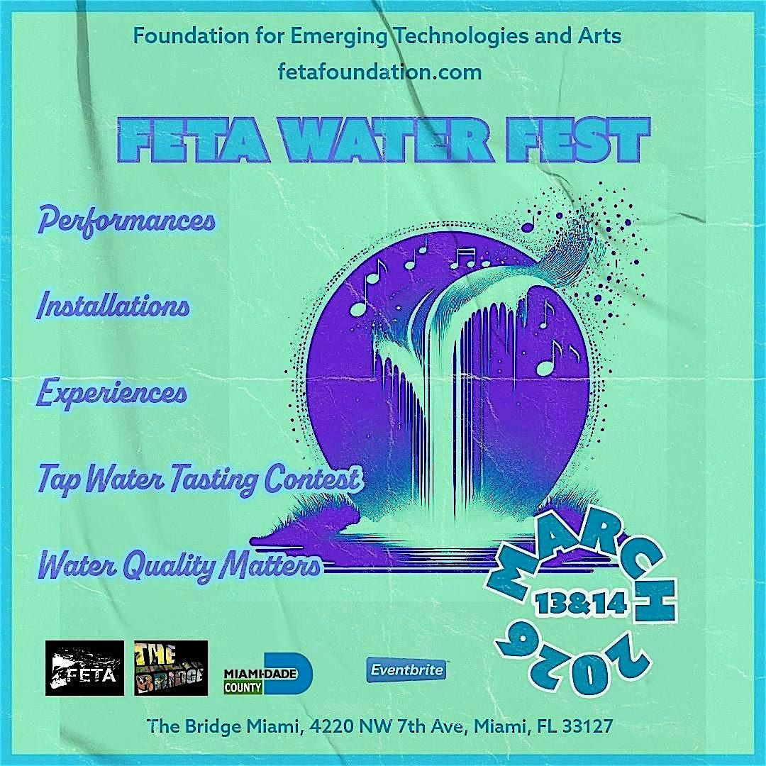 FETA Water Fest, in partnership with The Bridge Miami, is a two‑day experimental sound‑art‑and‑technology festival dedicated to drinking water—its sonic life, its cultural presence, and our shared responsibility for its future. The festival features artists including Alex Lough (NJ), Margaret Lancaster (NYC), Troy Rogers (MN), May Klug (MN), Charles Peoples III (VT), Paula Matthusen (CT), Jeniffer Beattie (NC), Nicole Martinez (FL), and Brian Niños (FL). Additional programming includes a session on water quality in beverages and the Best Miami Tap Water Competition.