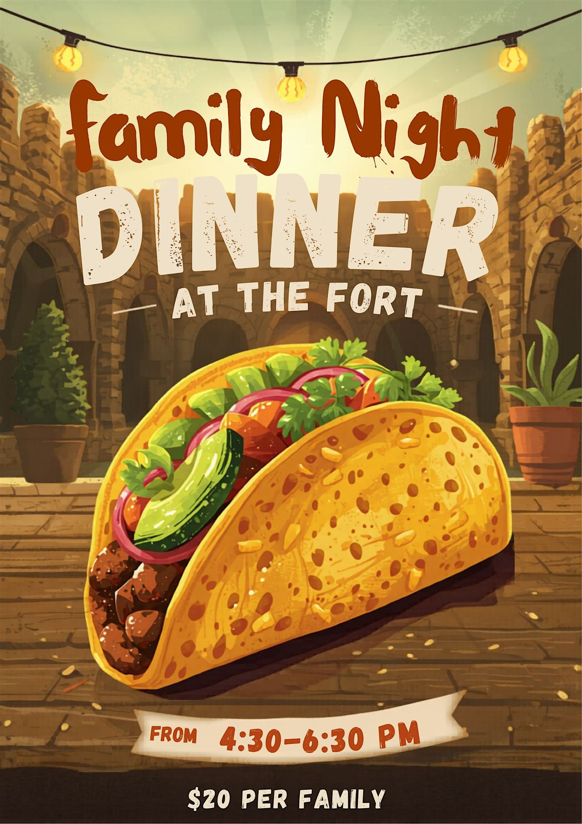We look forward to welcoming you and your family for a delicious, easy, and fun taco night at the Fort!